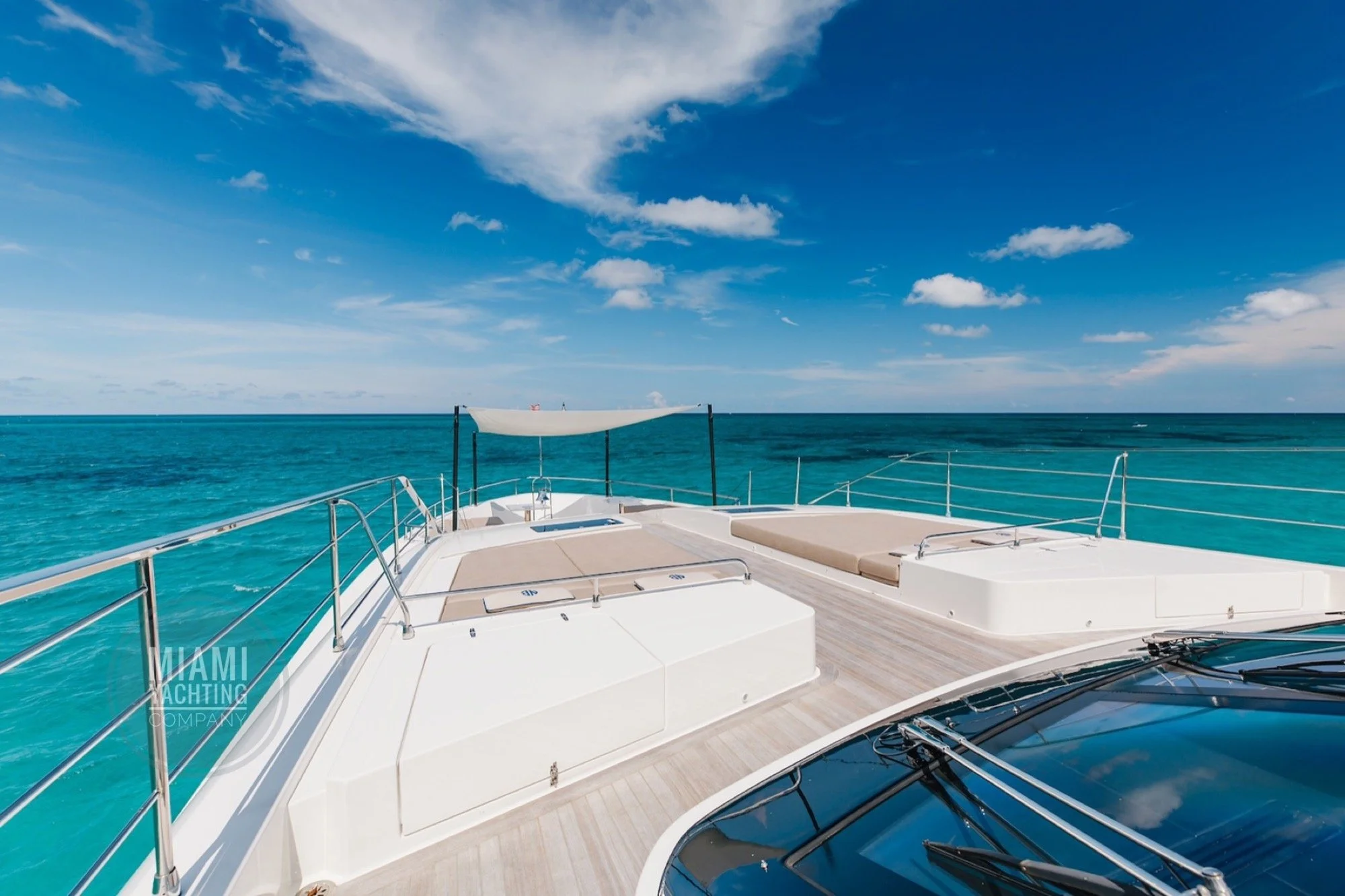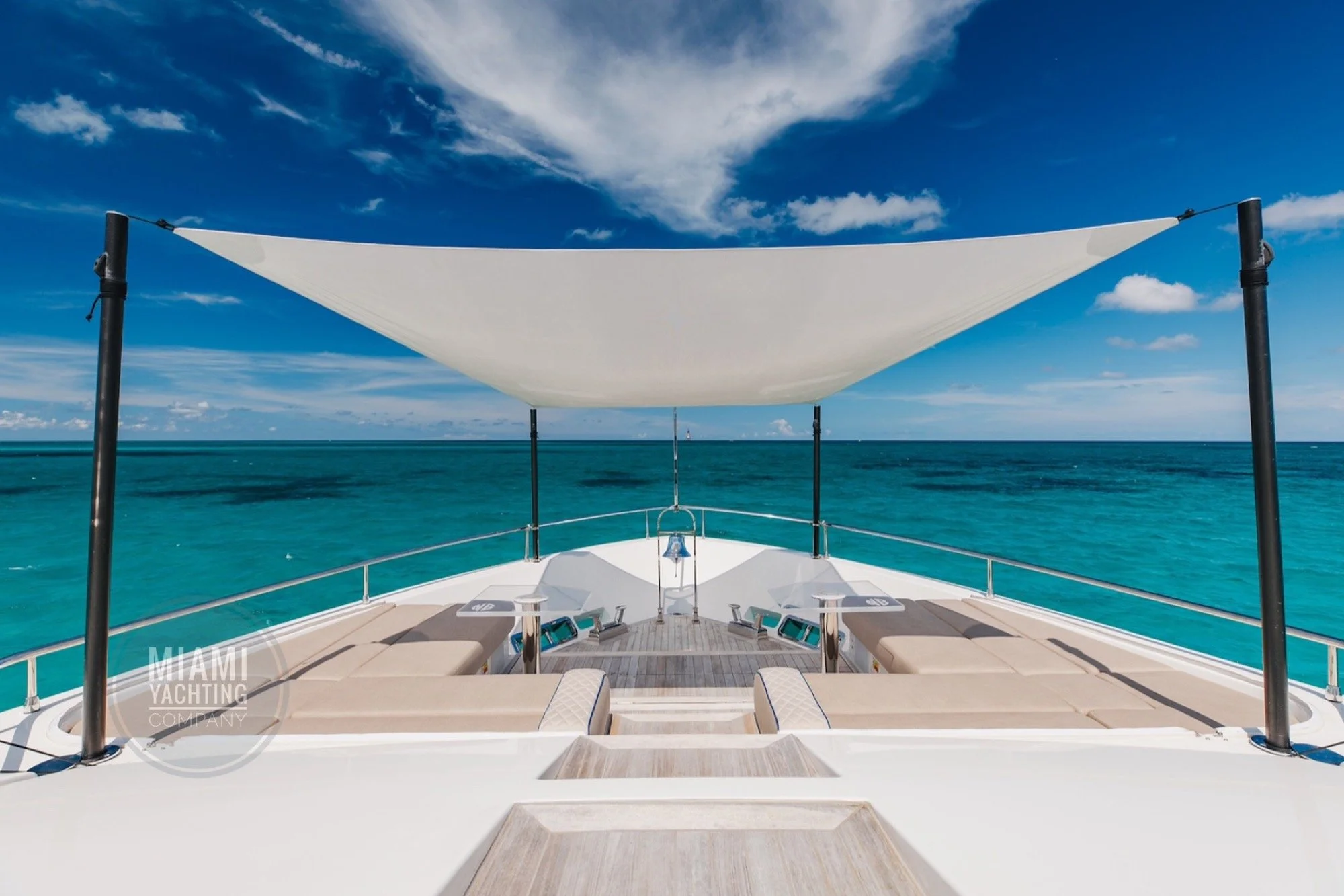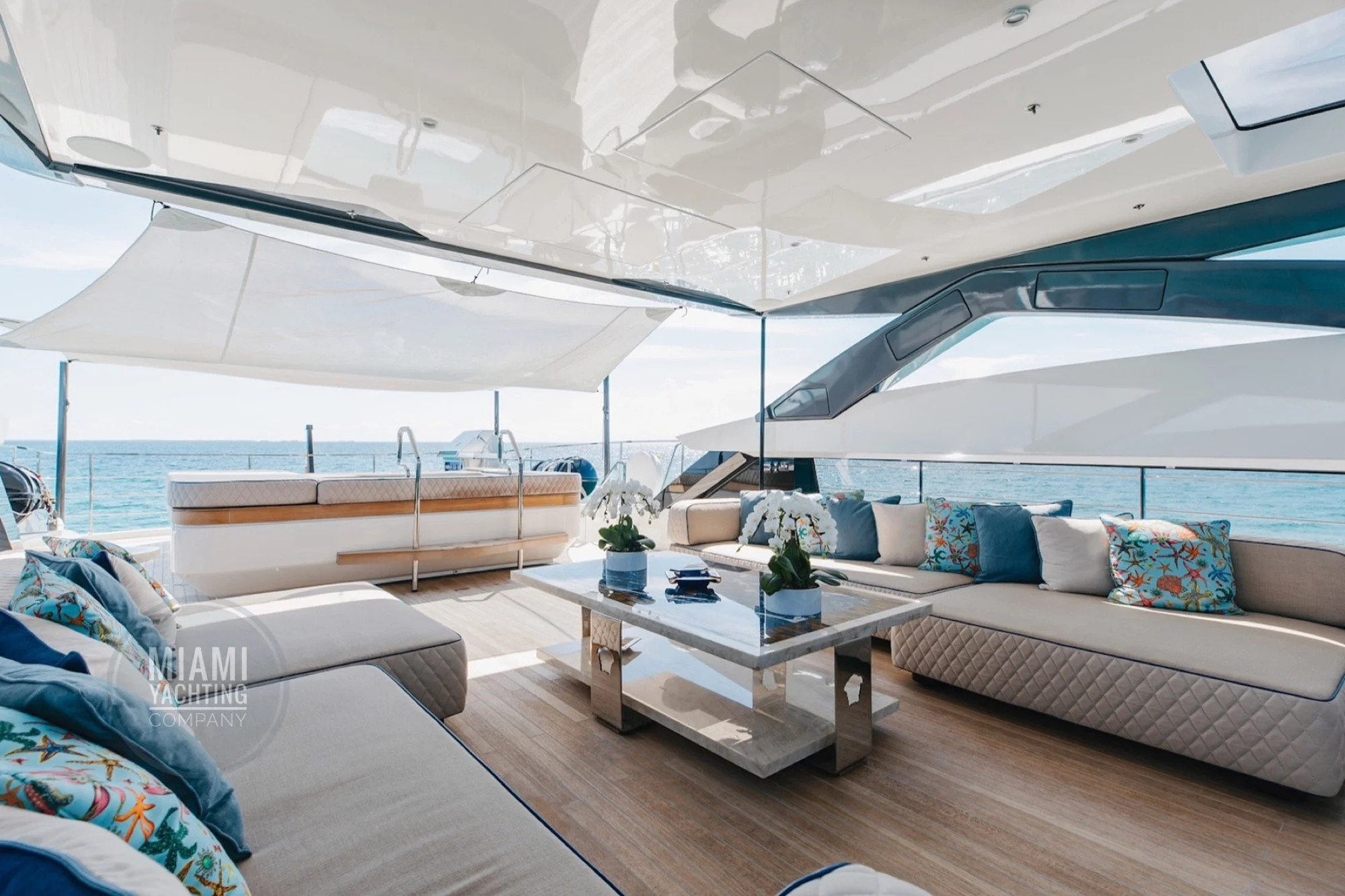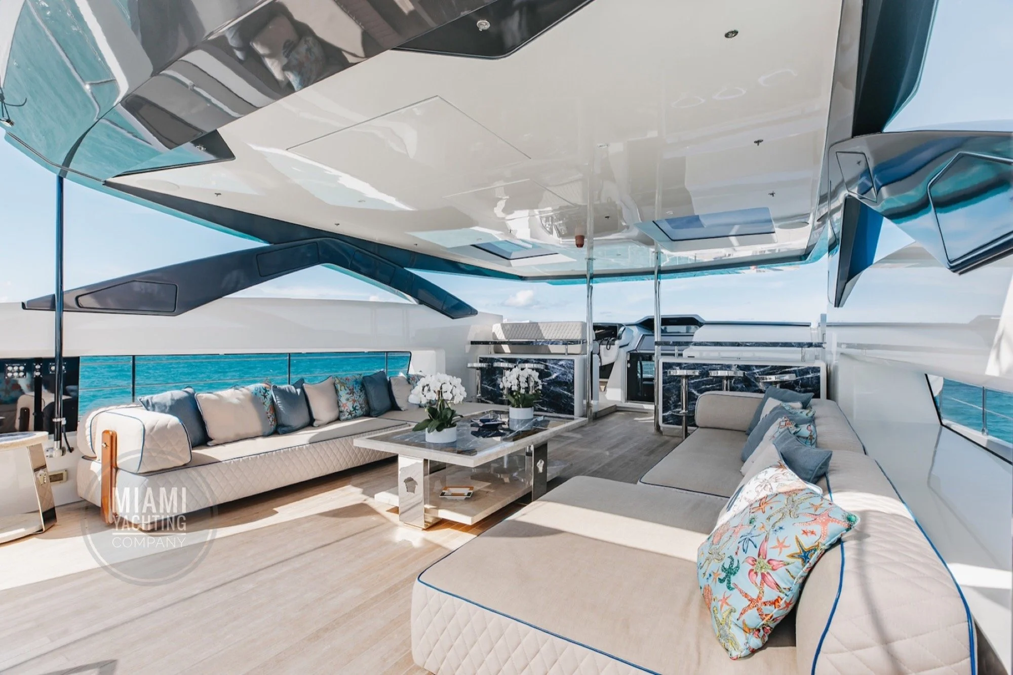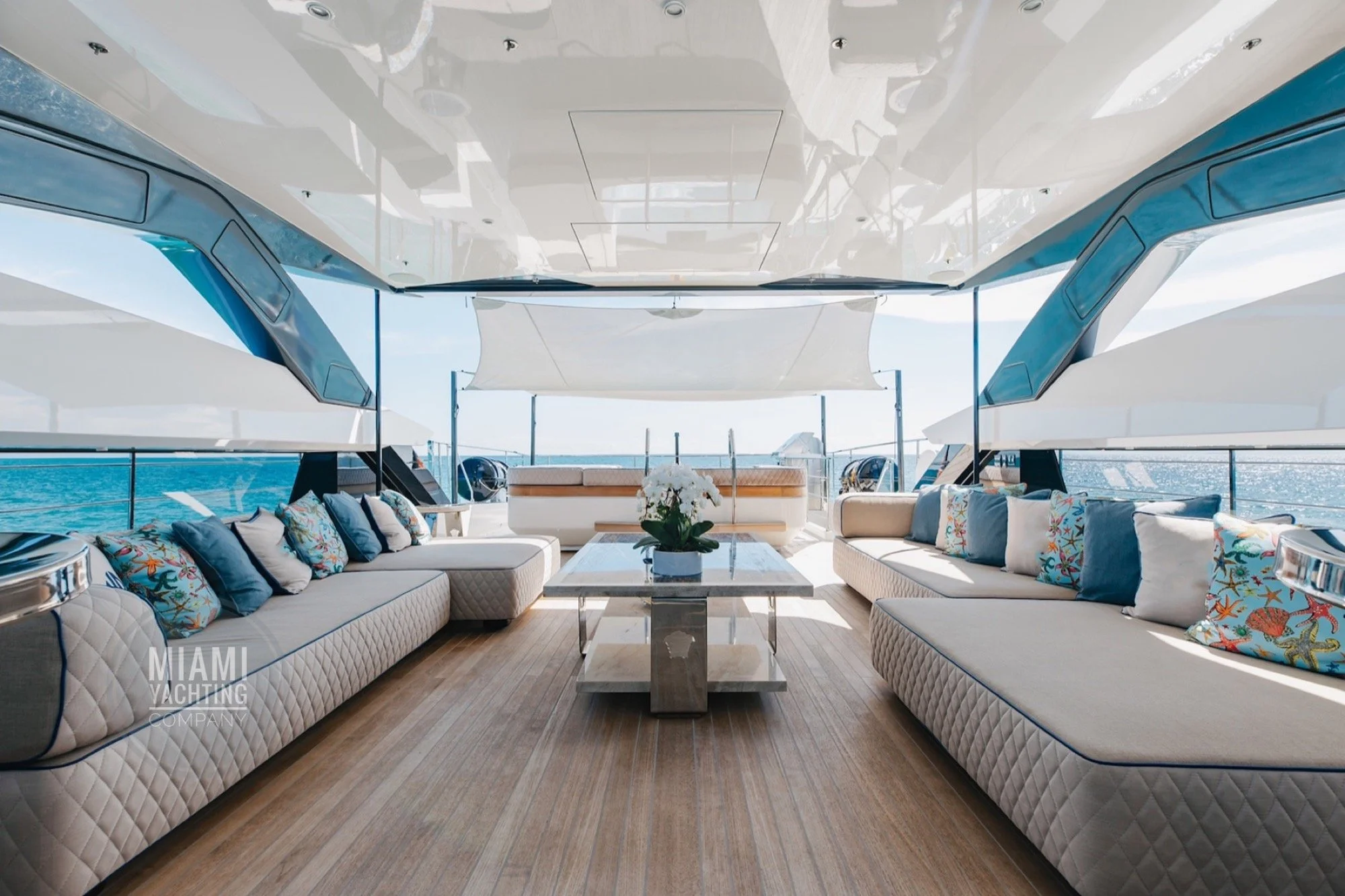 The layout is centered around open air living and sophisticated interior design, with generous deck spaces for sun lounging, dining and social gatherings. Inside, the yacht features a bright contemporary interior with full height windows, premium finishes and a seamless flow between spaces that feels both modern and inviting. Every detail reflects Ferretti’s commitment to quality, comfort and timeless design.
