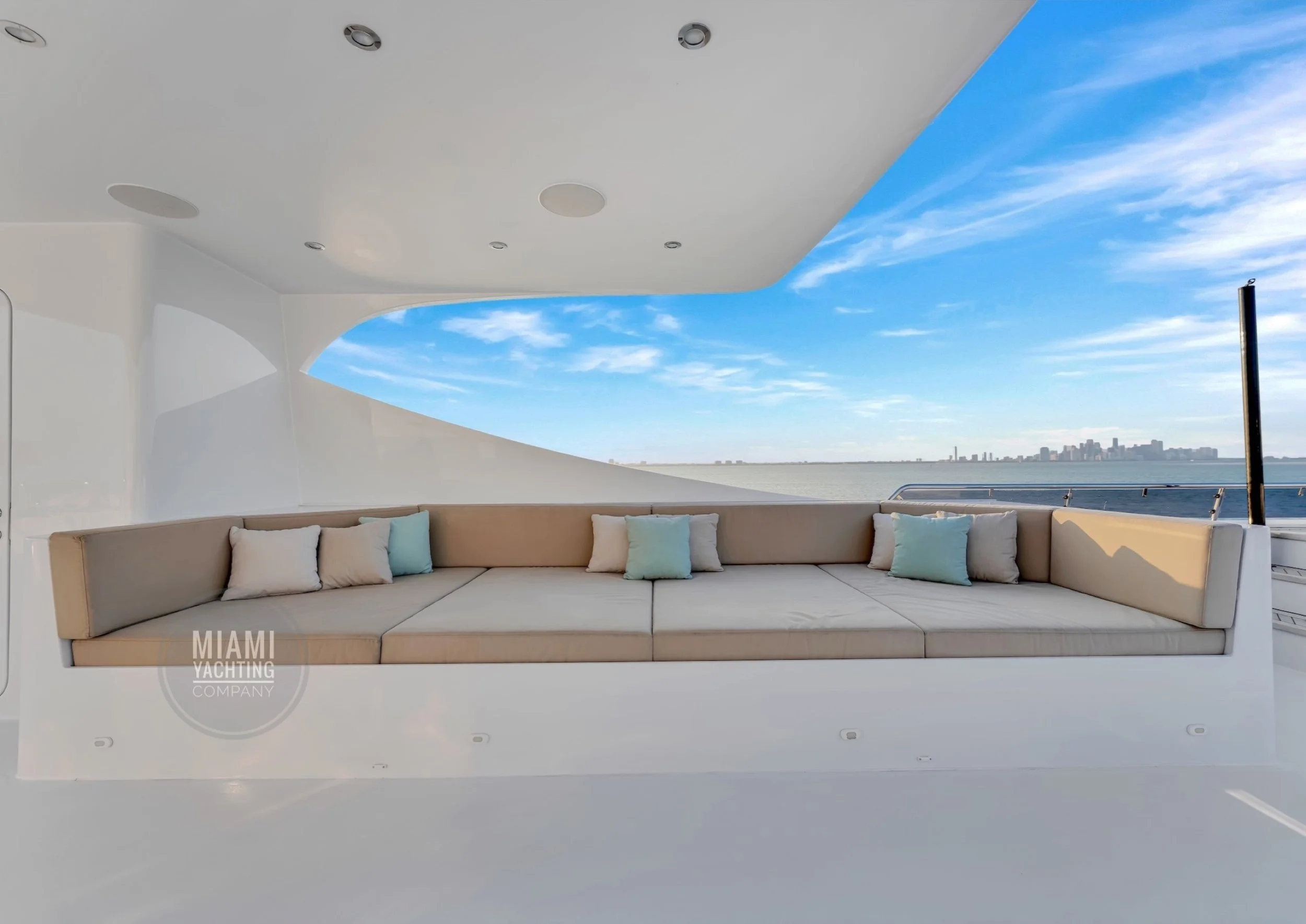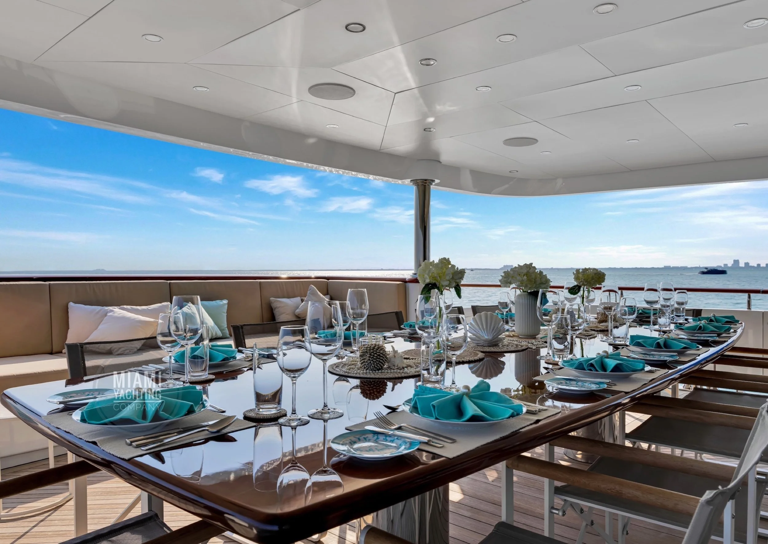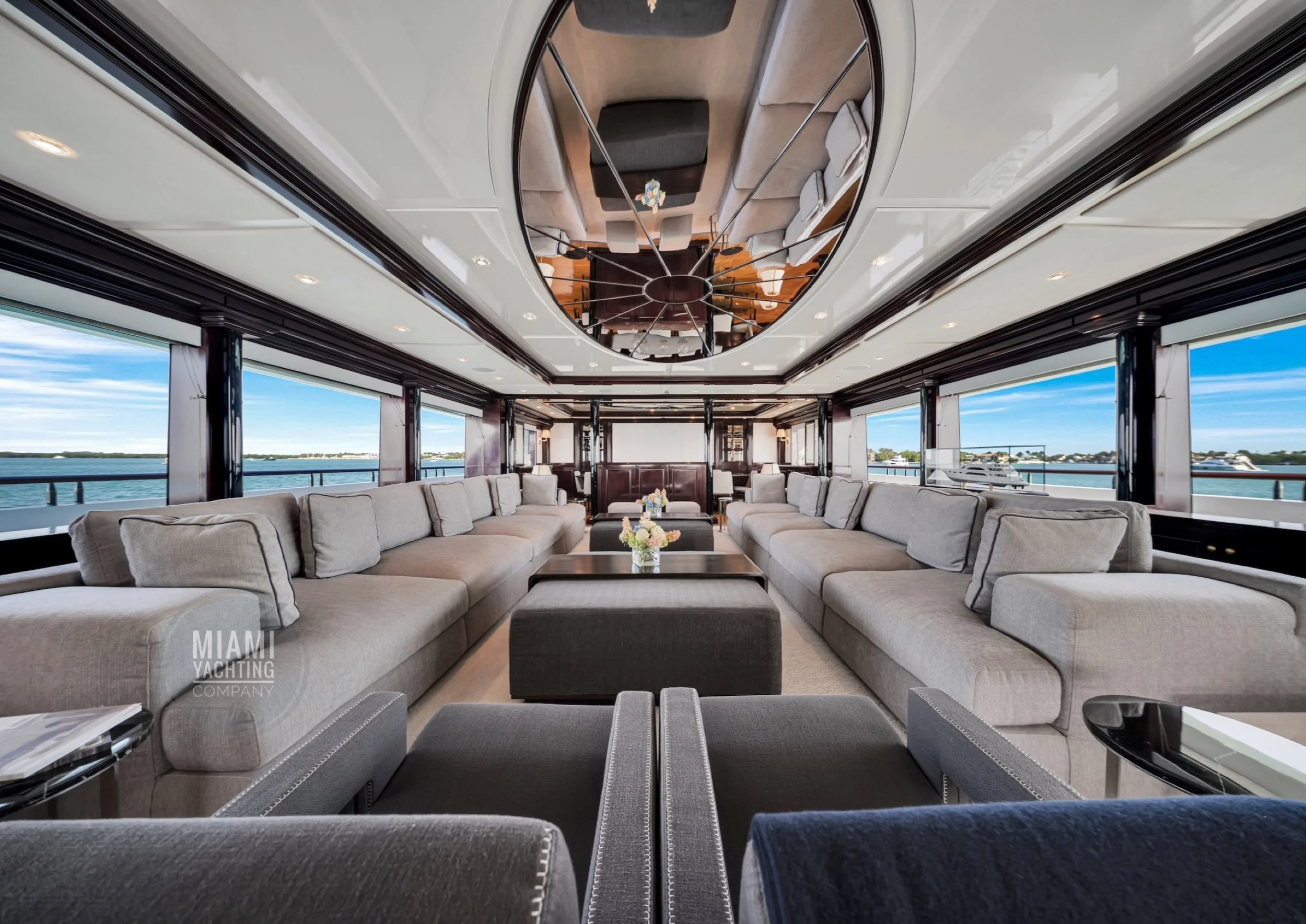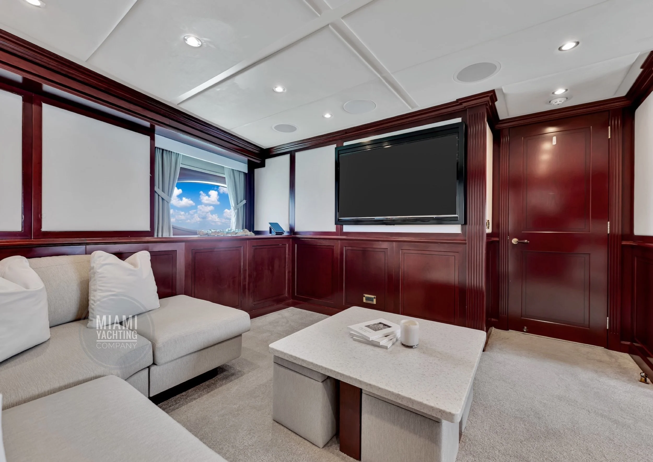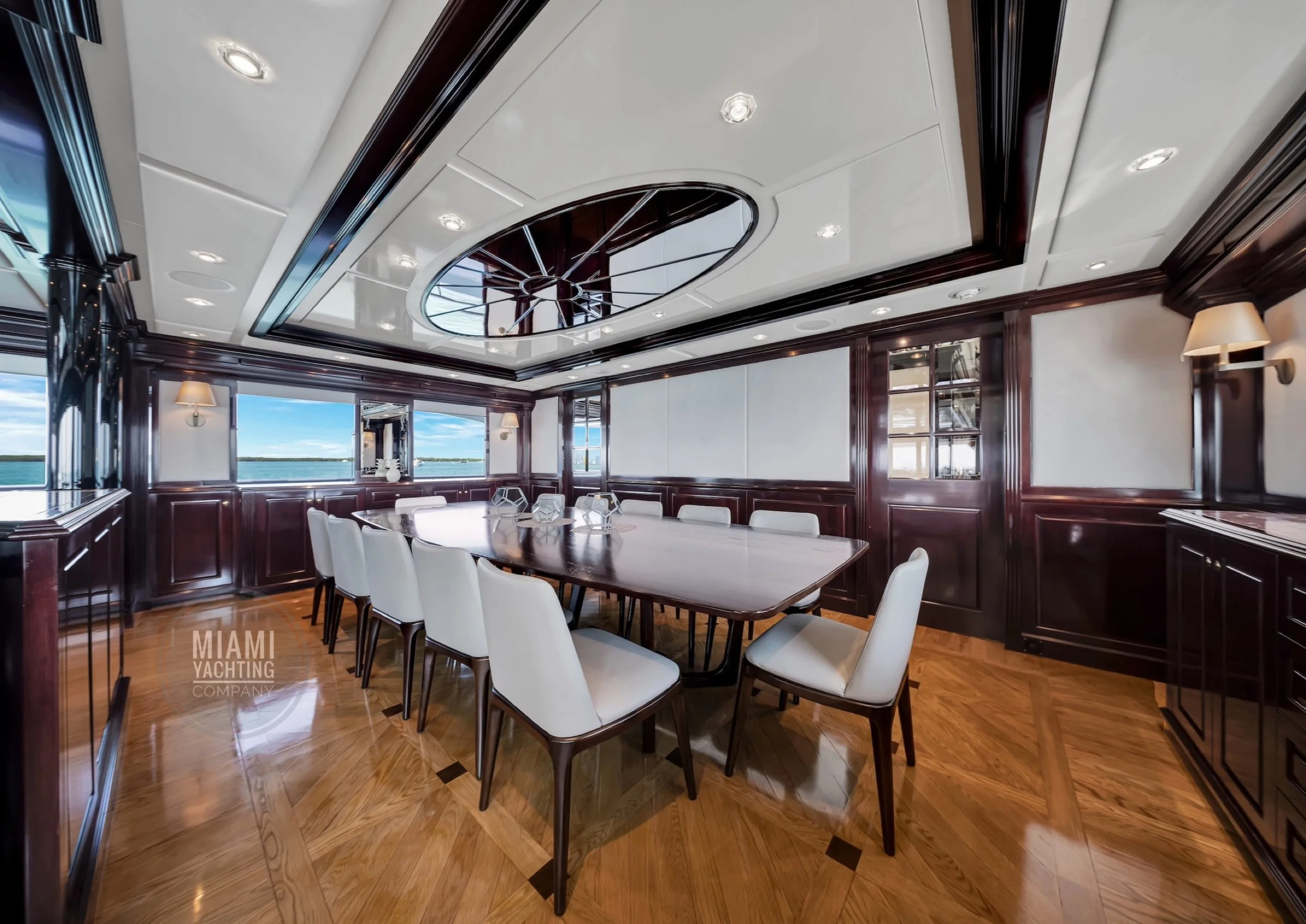 The interior is refined and contemporary, blending rich mahogany cabinetry with polished wood flooring and sleek black accents. The salon is bright and spacious with oversized windows, a formal dining area, and state-of-the-art entertainment systems. Every detail is crafted to provide an exceptional onboard experience that seamlessly combines style and relaxation for your Miami yacht charter.