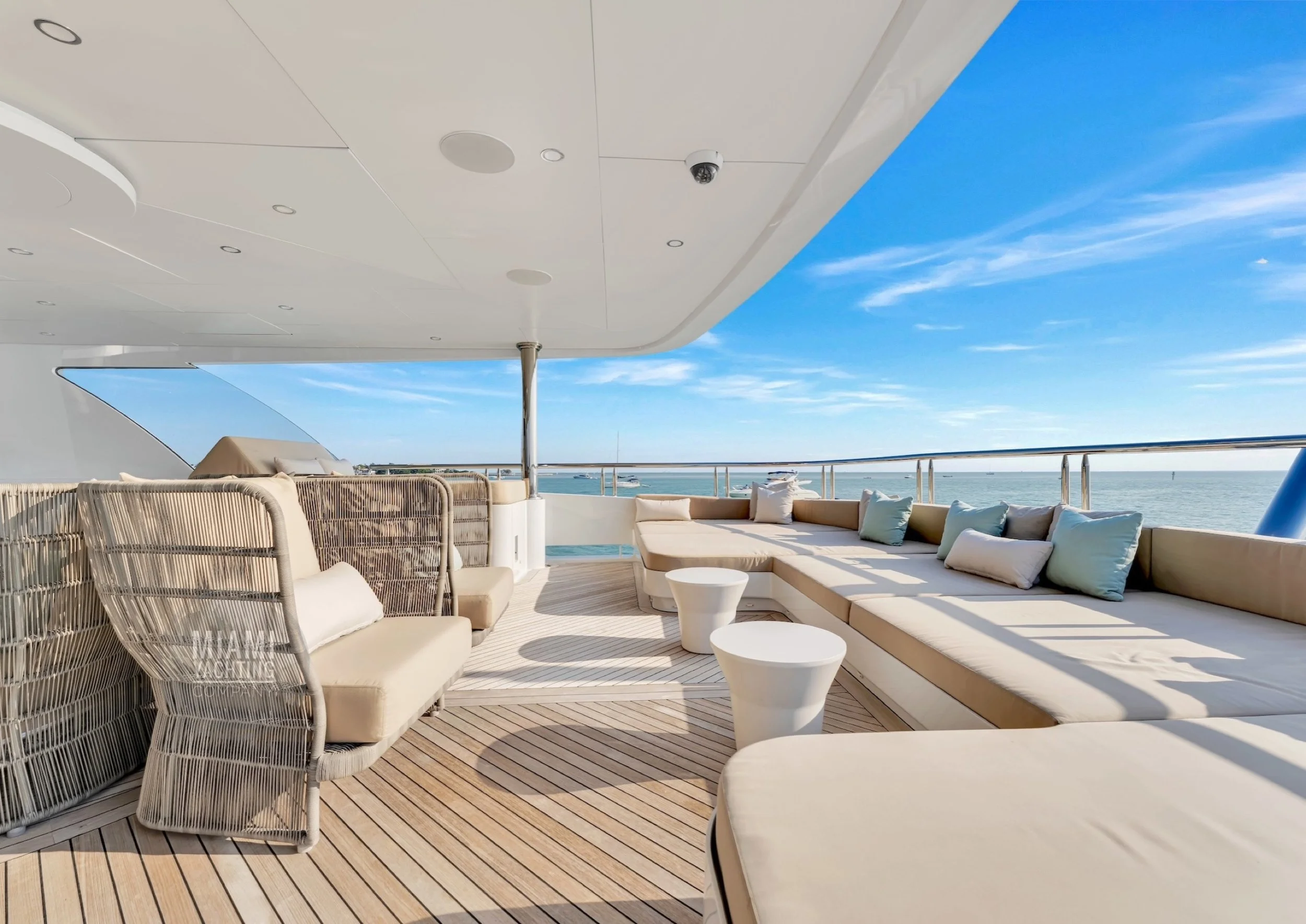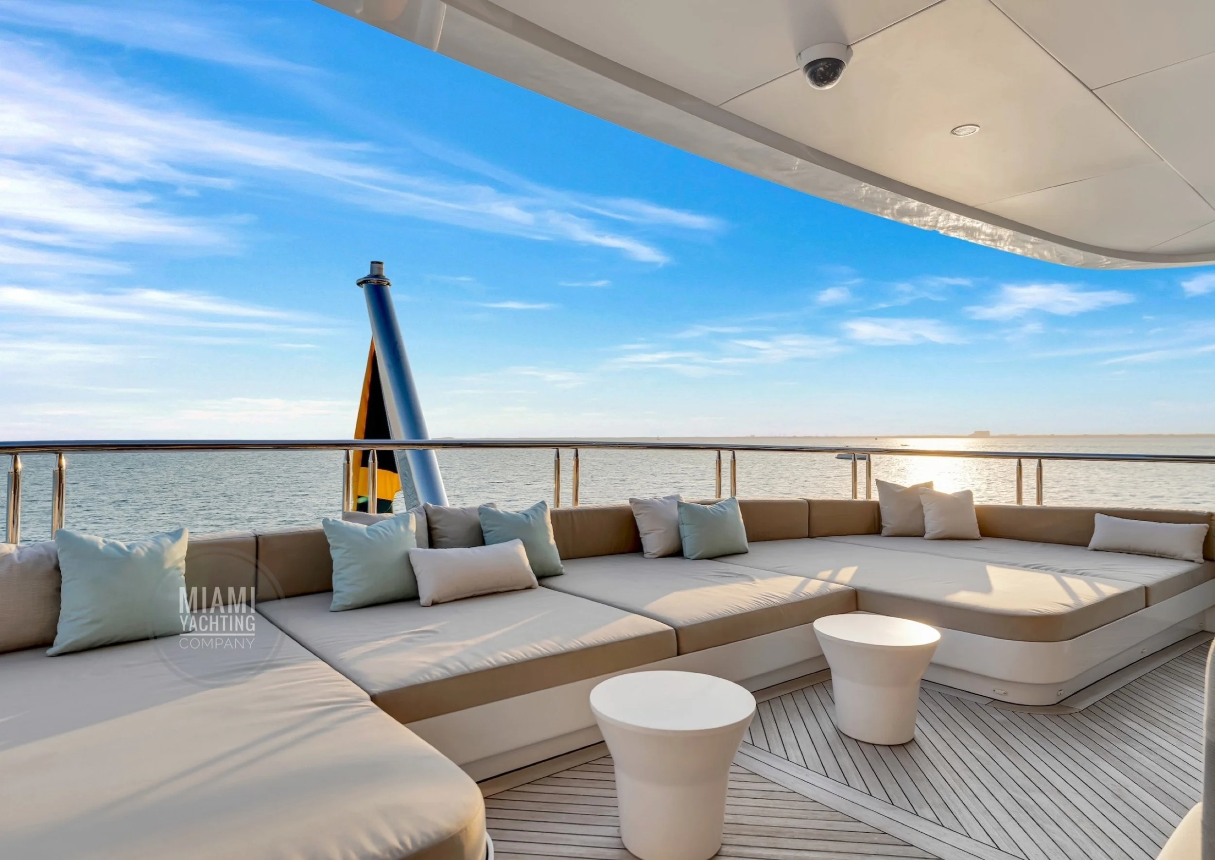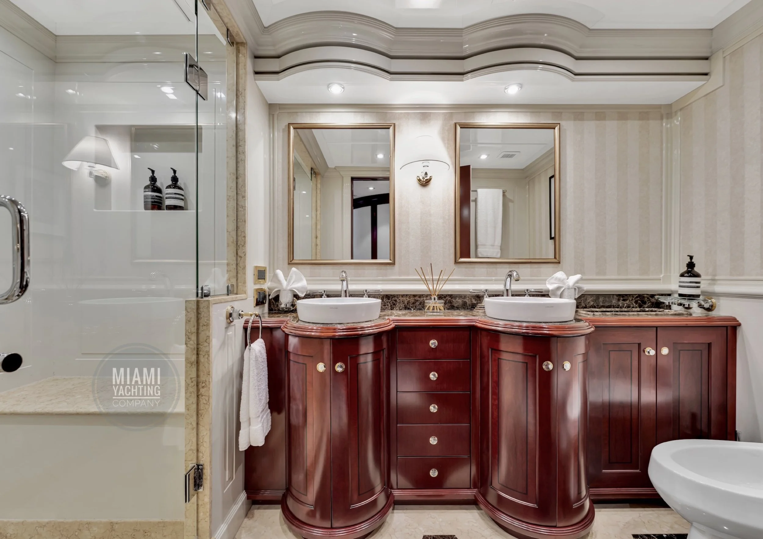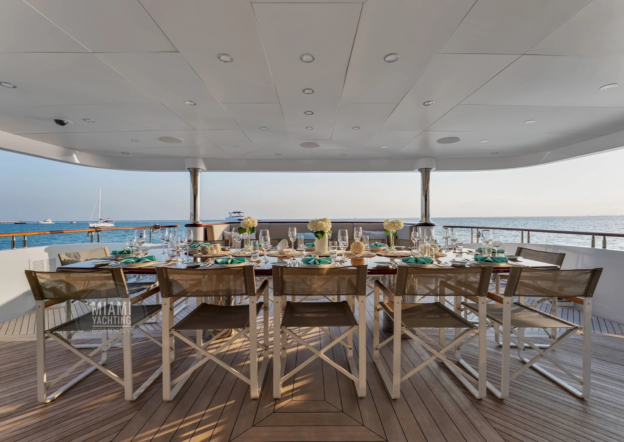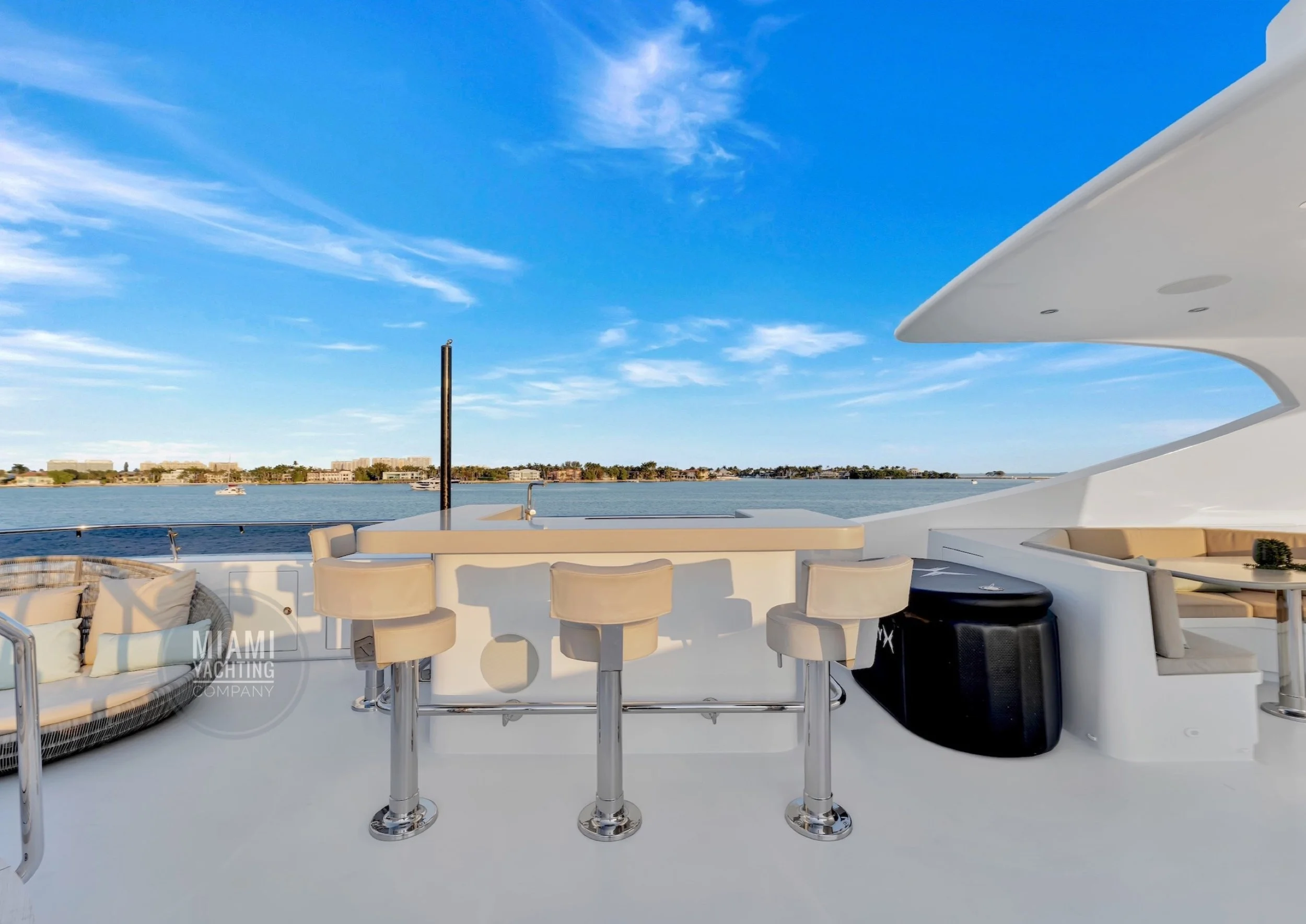 The interior is refined and contemporary, blending rich mahogany cabinetry with polished wood flooring and sleek black accents. The salon is bright and spacious with oversized windows, a formal dining area, and state-of-the-art entertainment systems. Every detail is crafted to provide an exceptional onboard experience that seamlessly combines style and relaxation for your Miami yacht charter.