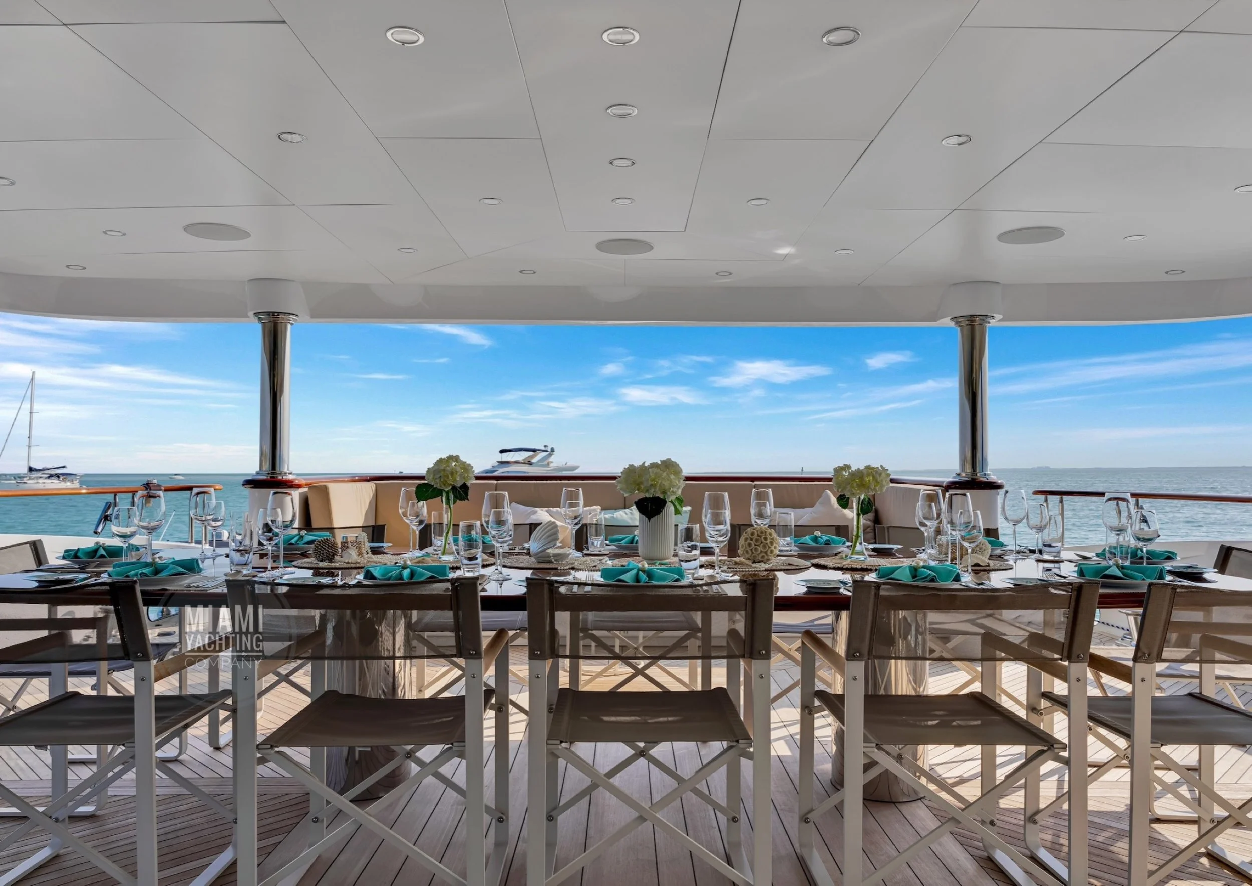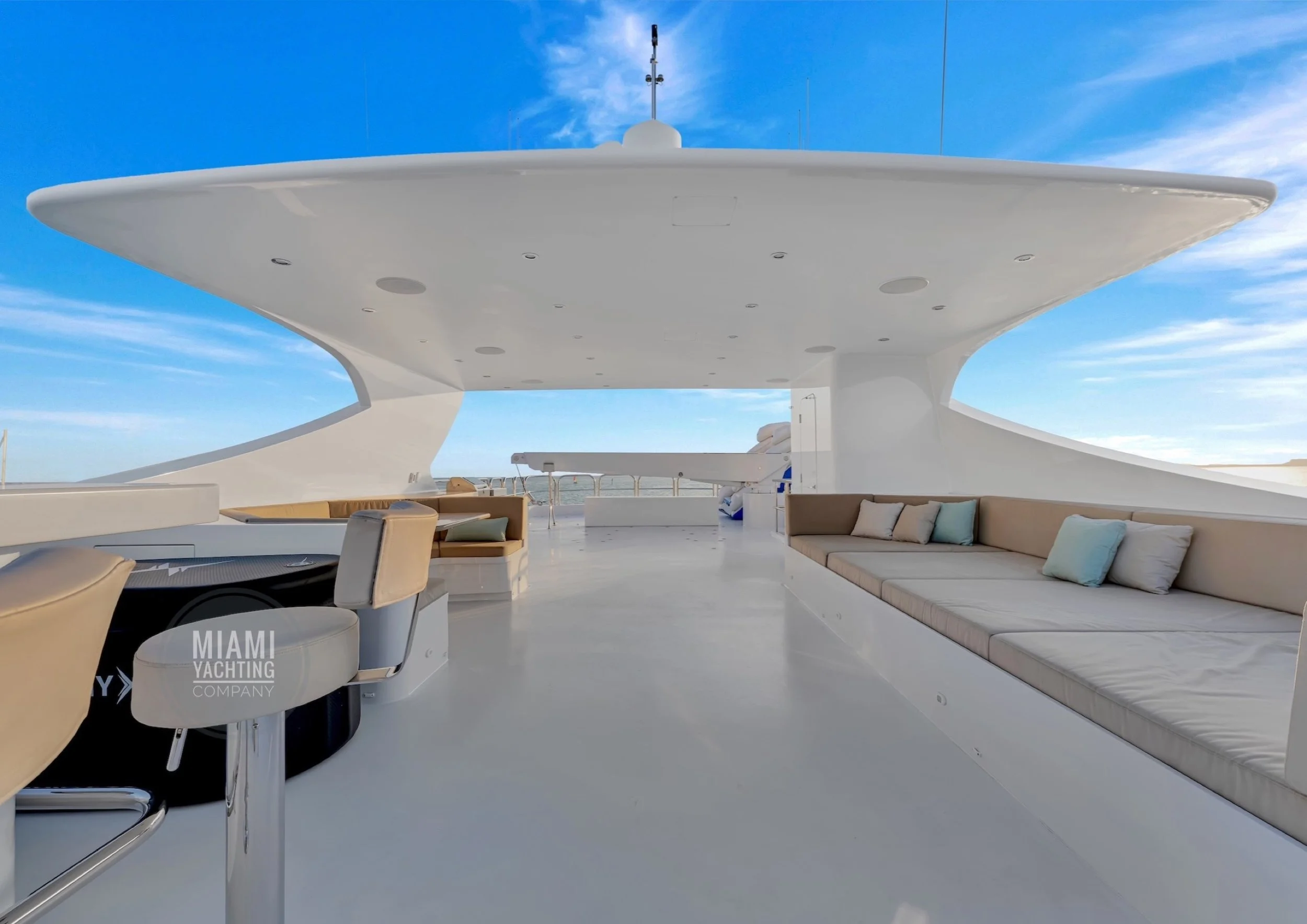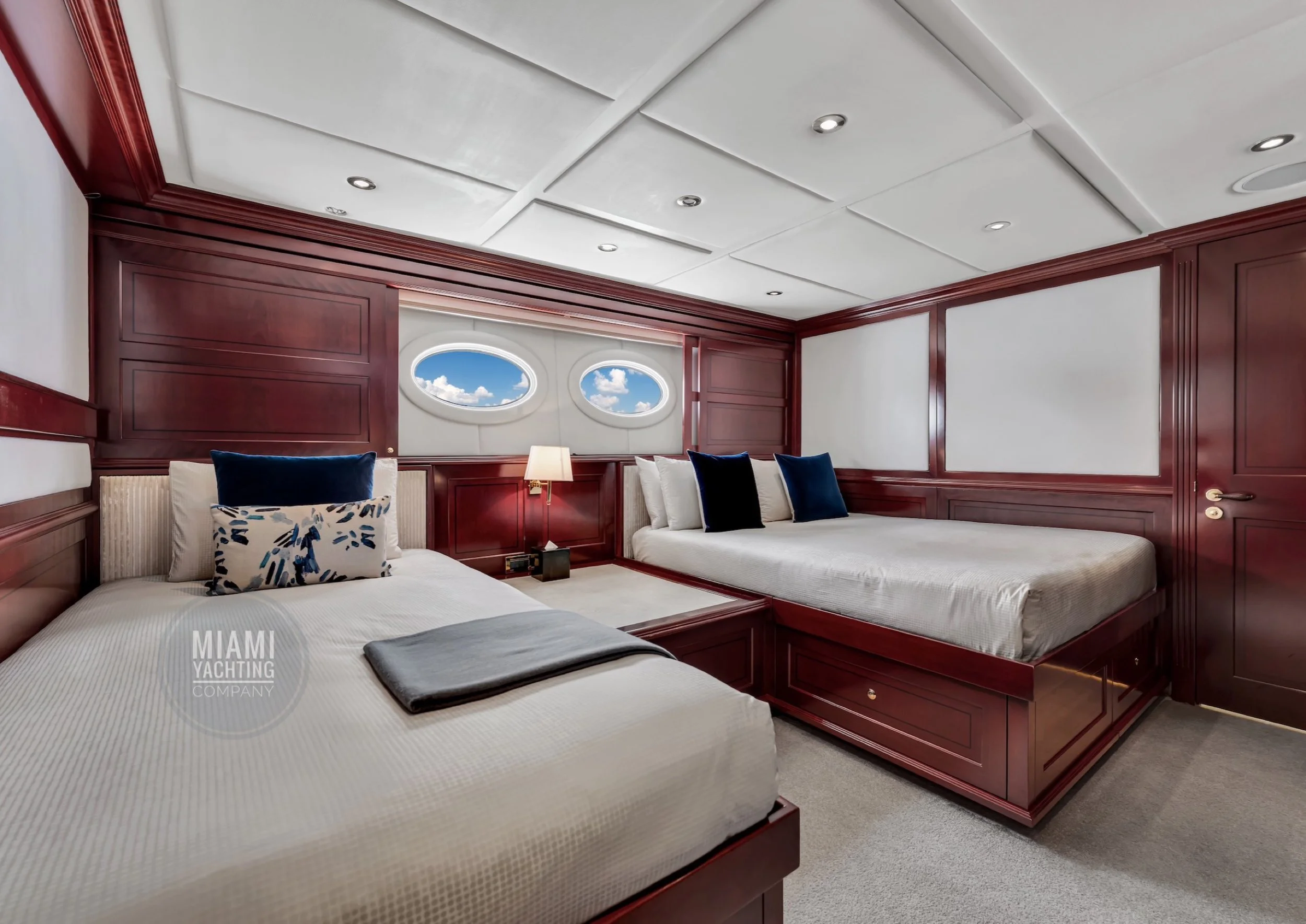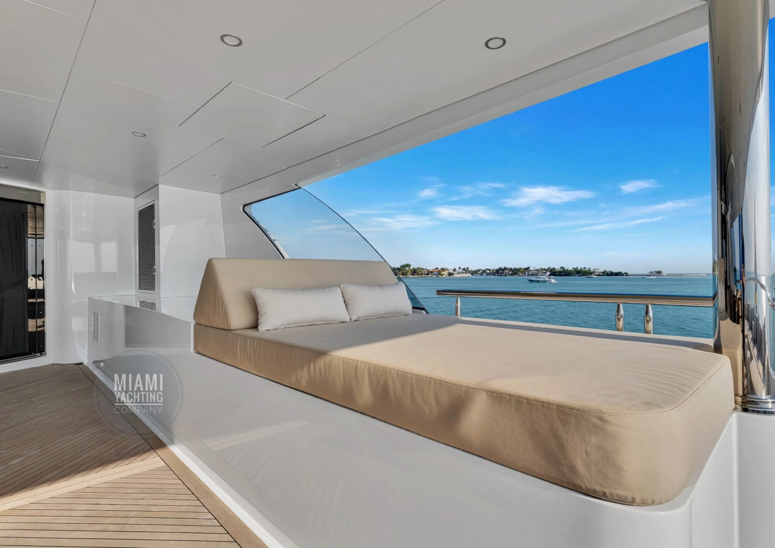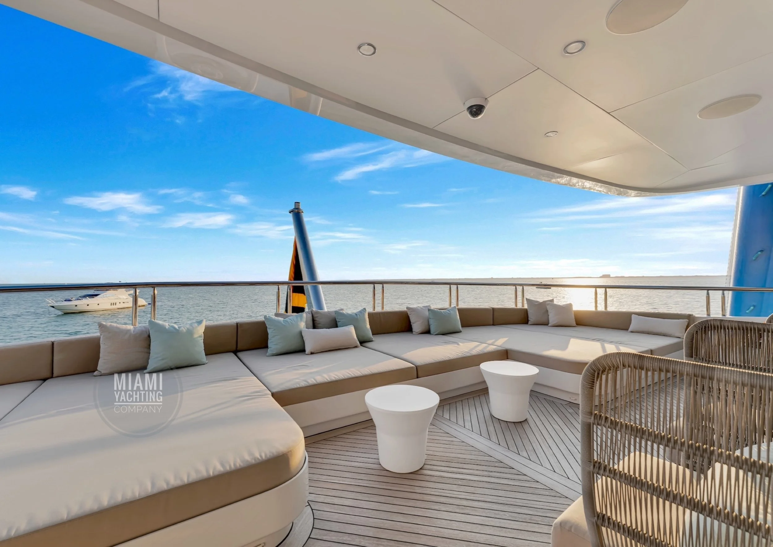 The interior is refined and contemporary, blending rich mahogany cabinetry with polished wood flooring and sleek black accents. The salon is bright and spacious with oversized windows, a formal dining area, and state-of-the-art entertainment systems. Every detail is crafted to provide an exceptional onboard experience that seamlessly combines style and relaxation for your Miami yacht charter.