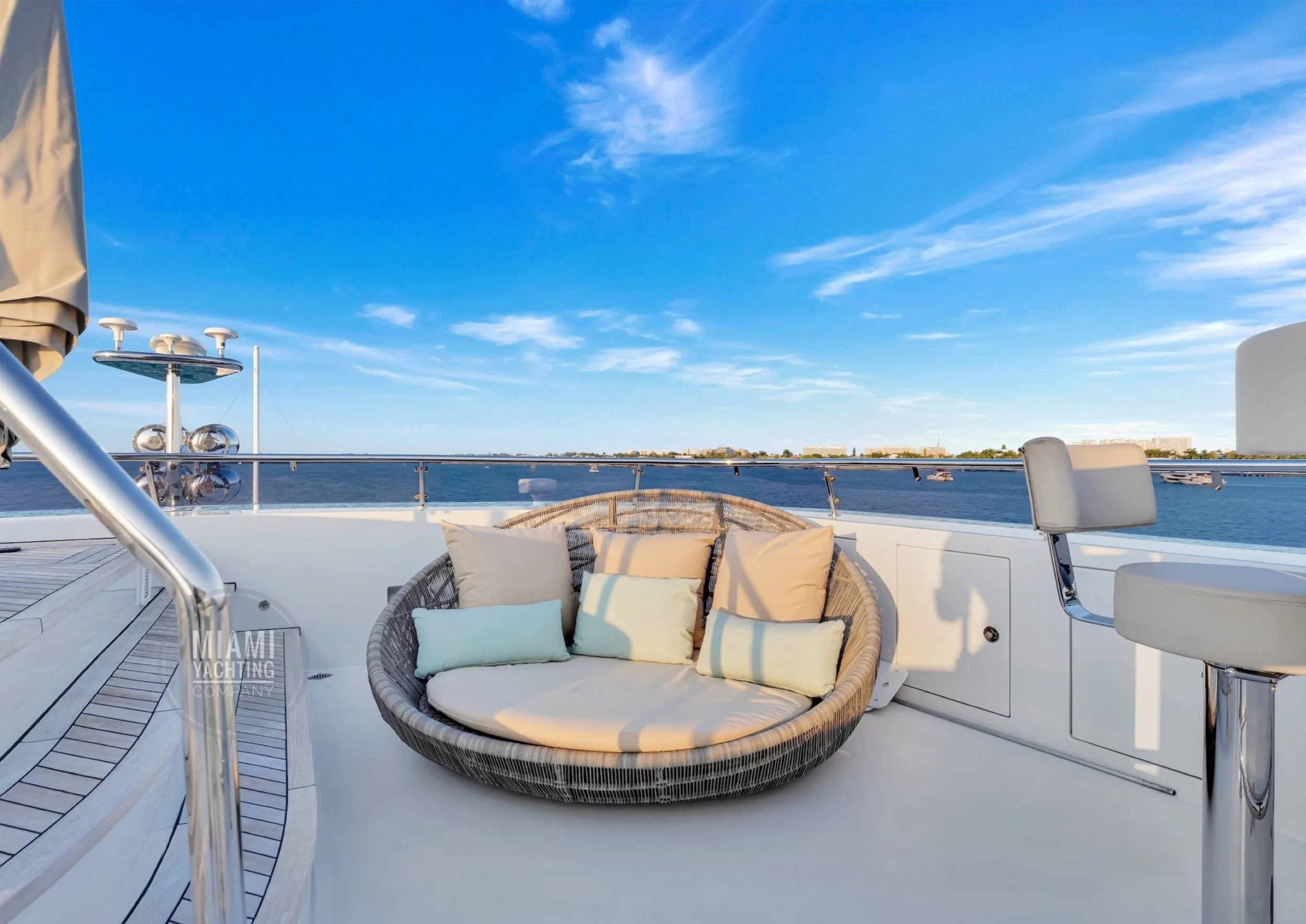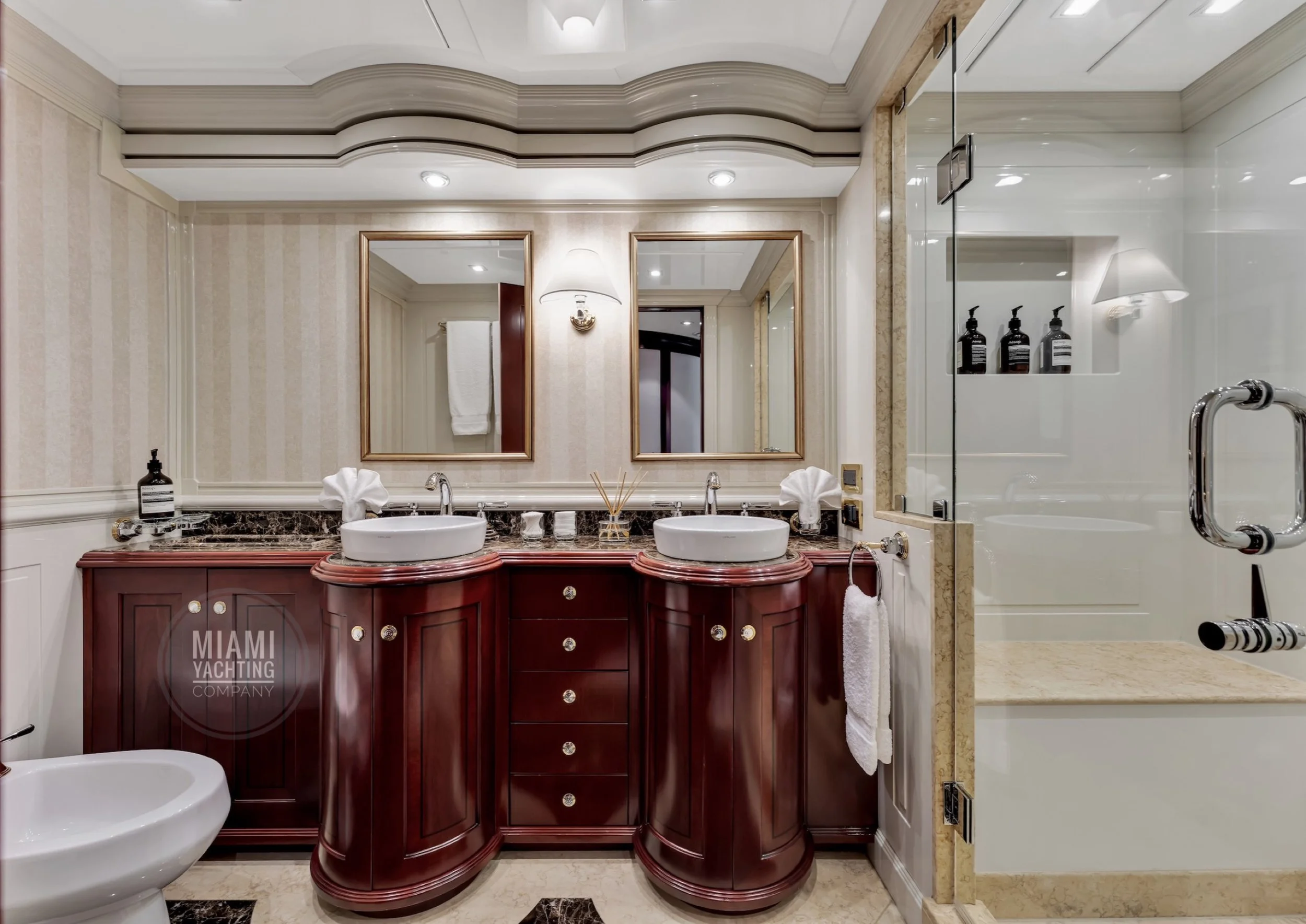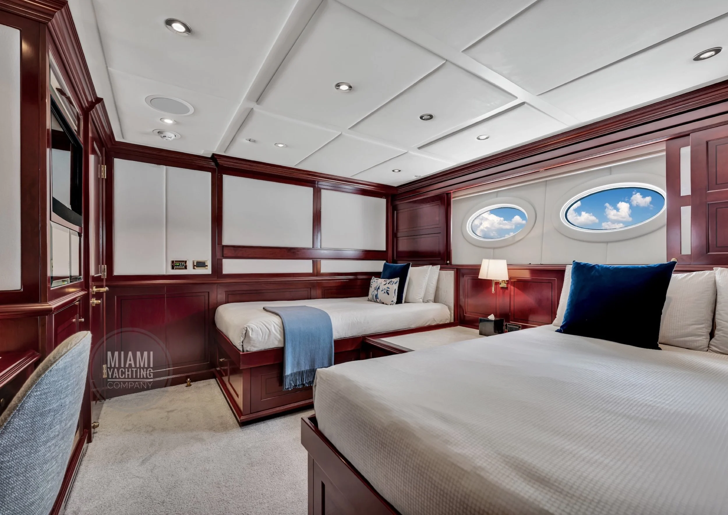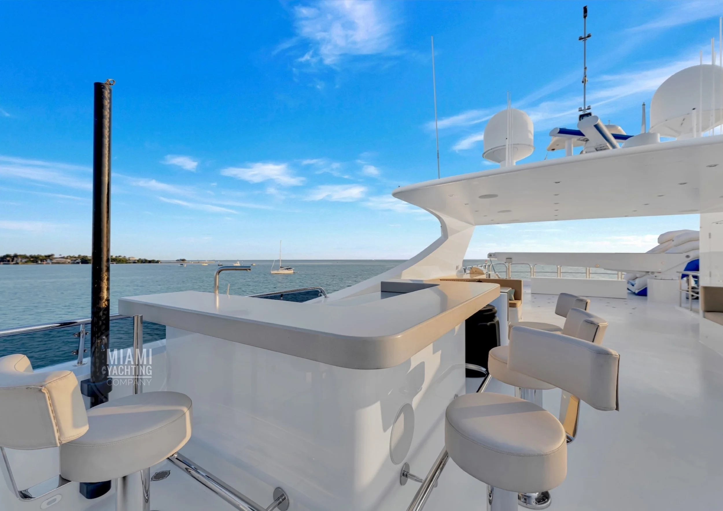 The interior is refined and contemporary, blending rich mahogany cabinetry with polished wood flooring and sleek black accents. The salon is bright and spacious with oversized windows, a formal dining area, and state-of-the-art entertainment systems. Every detail is crafted to provide an exceptional onboard experience that seamlessly combines style and relaxation for your Miami yacht charter.