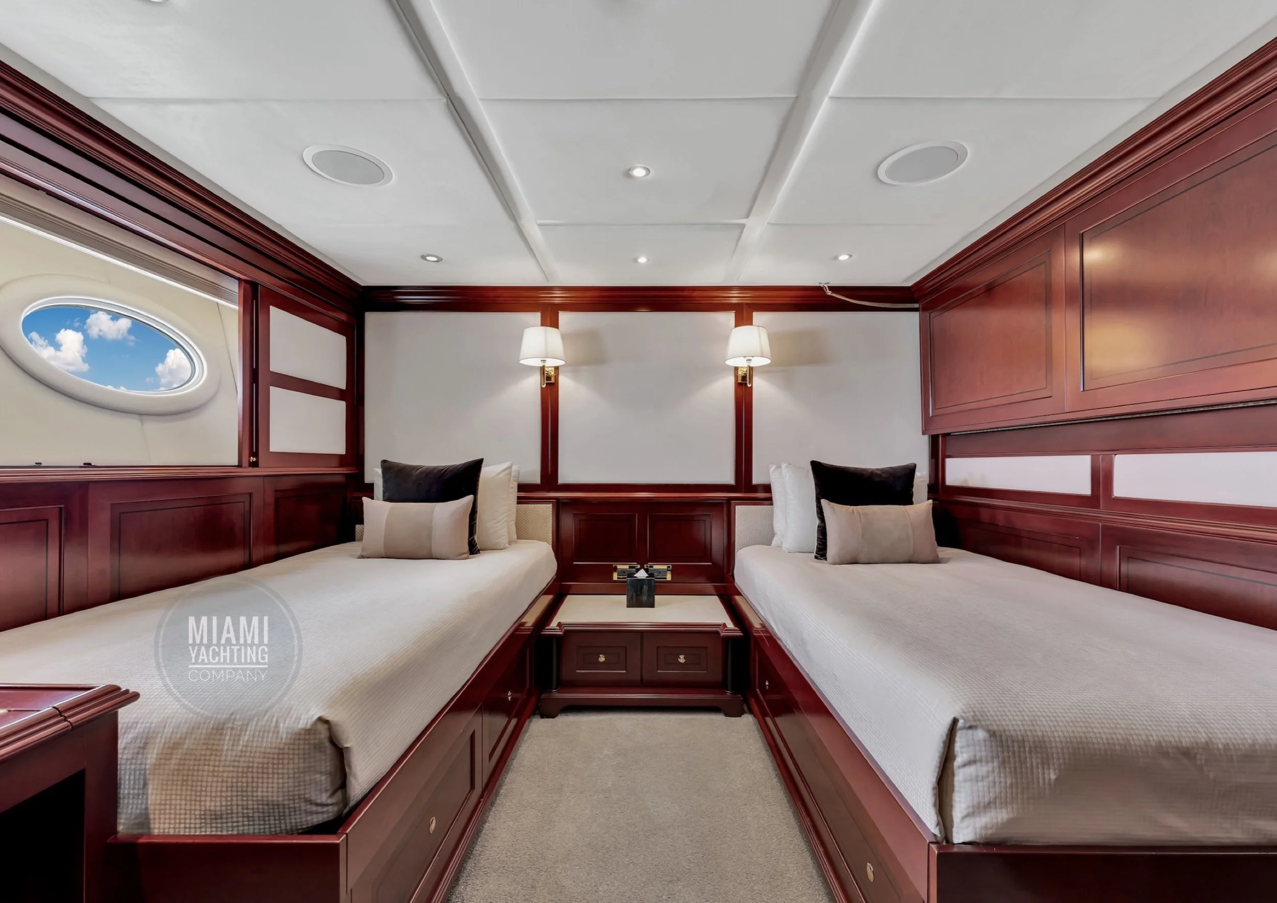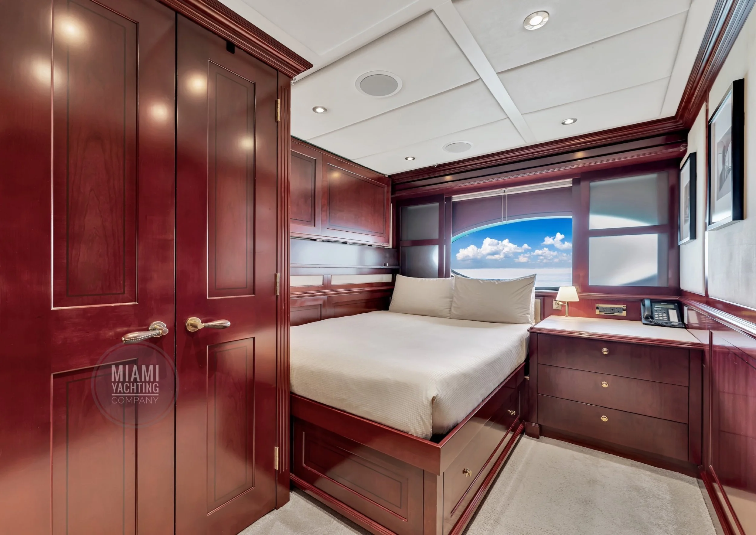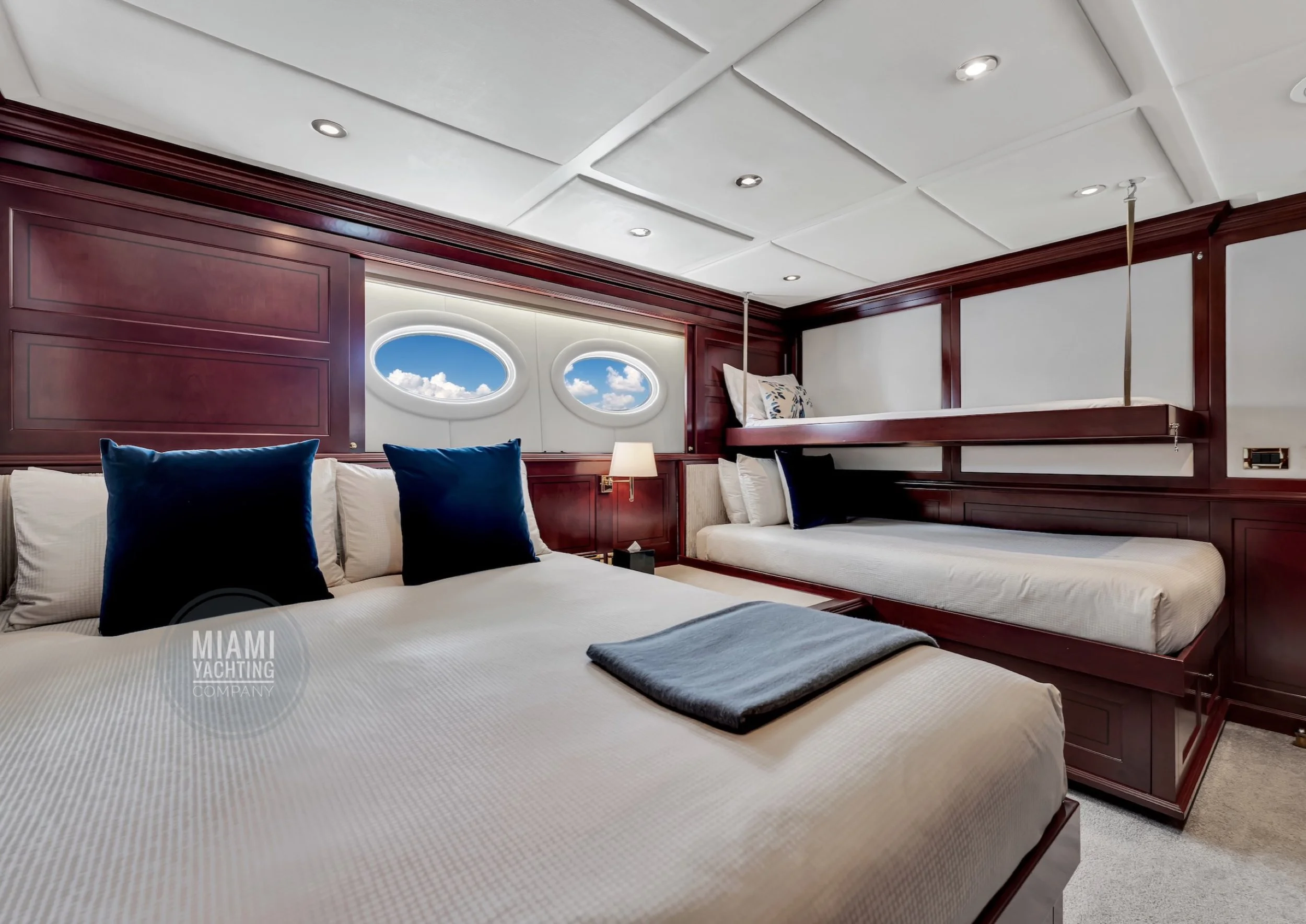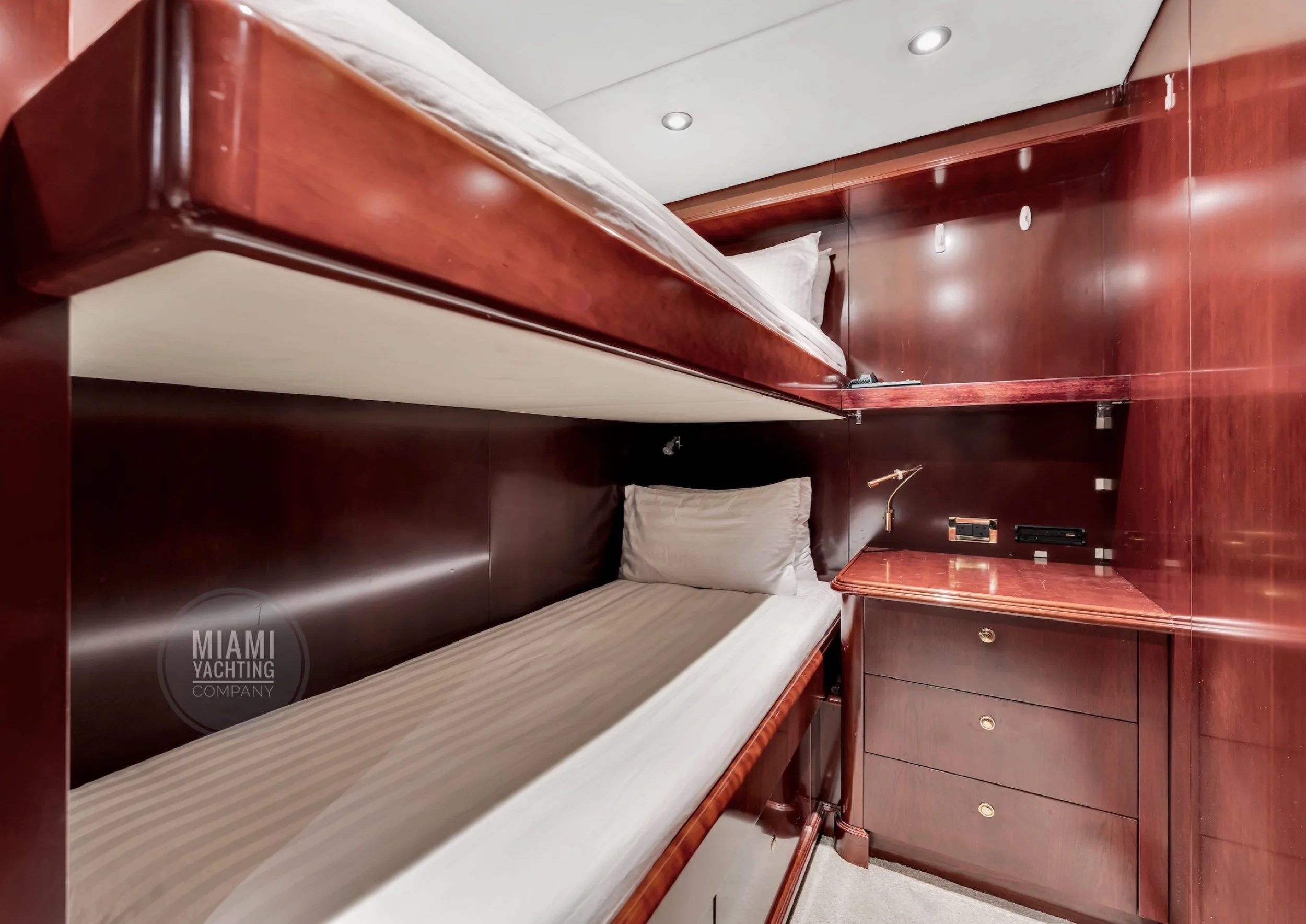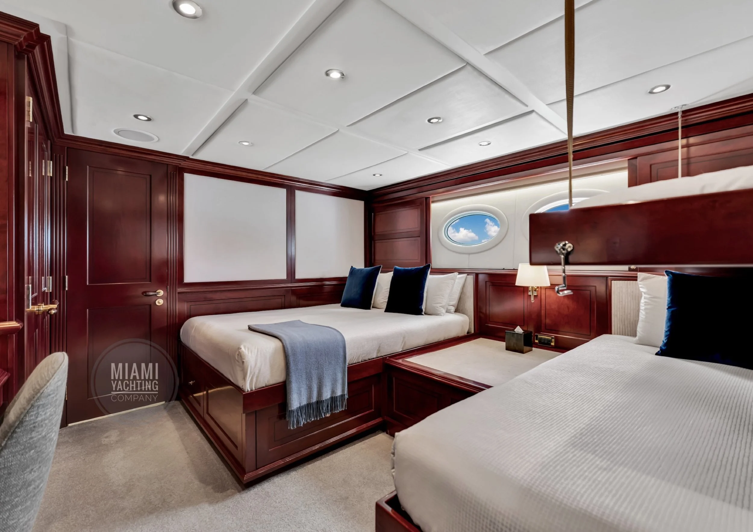 The interior is refined and contemporary, blending rich mahogany cabinetry with polished wood flooring and sleek black accents. The salon is bright and spacious with oversized windows, a formal dining area, and state-of-the-art entertainment systems. Every detail is crafted to provide an exceptional onboard experience that seamlessly combines style and relaxation for your Miami yacht charter.