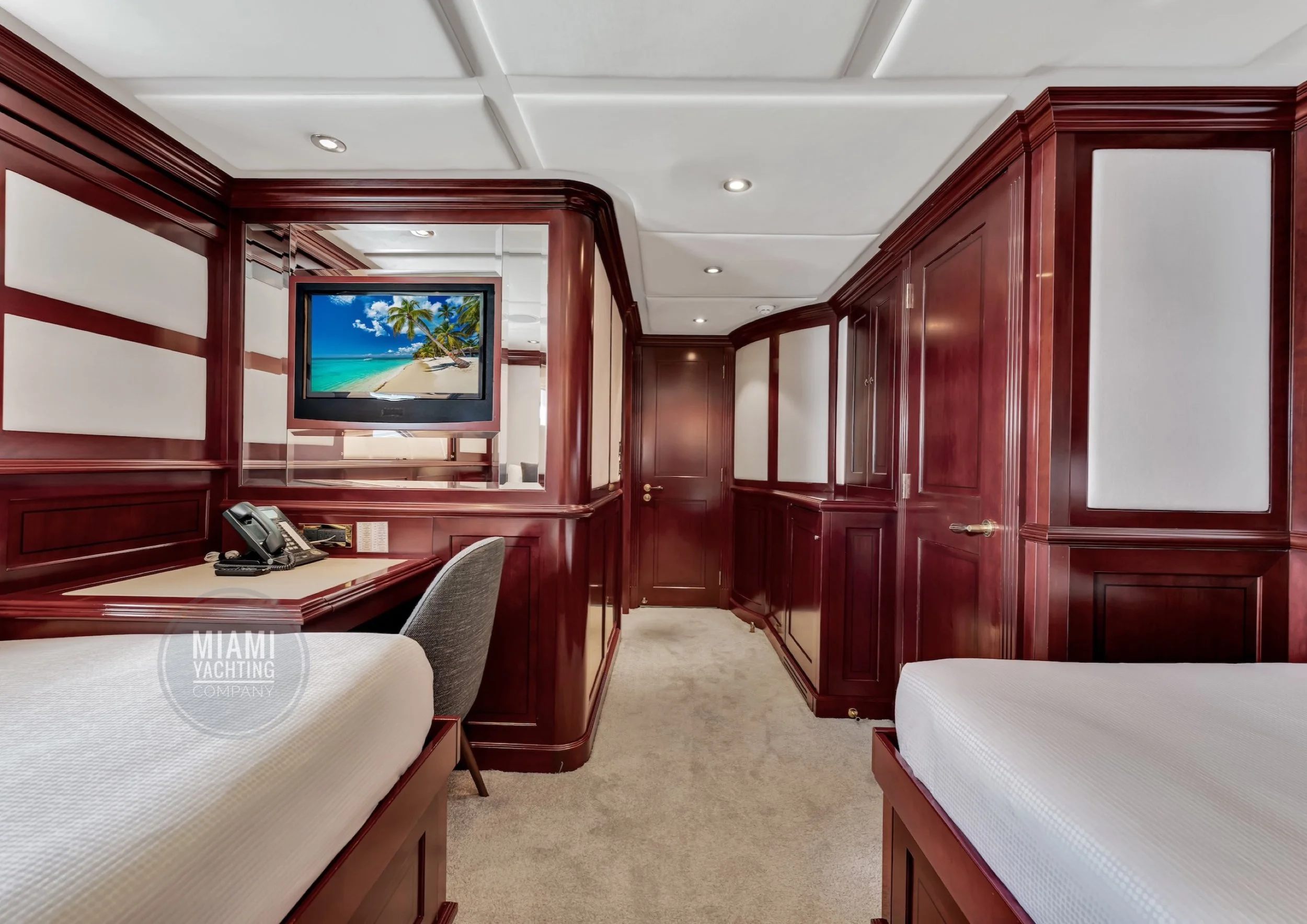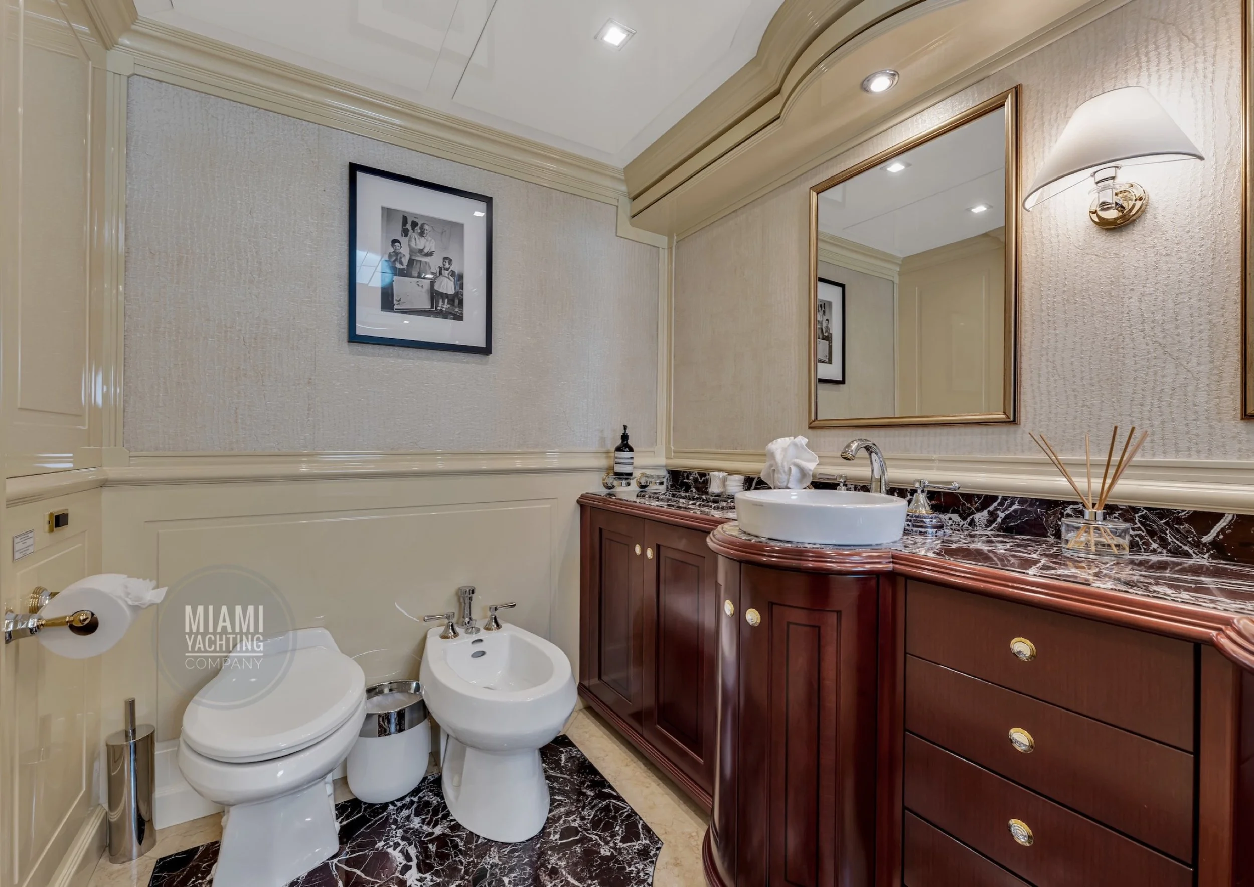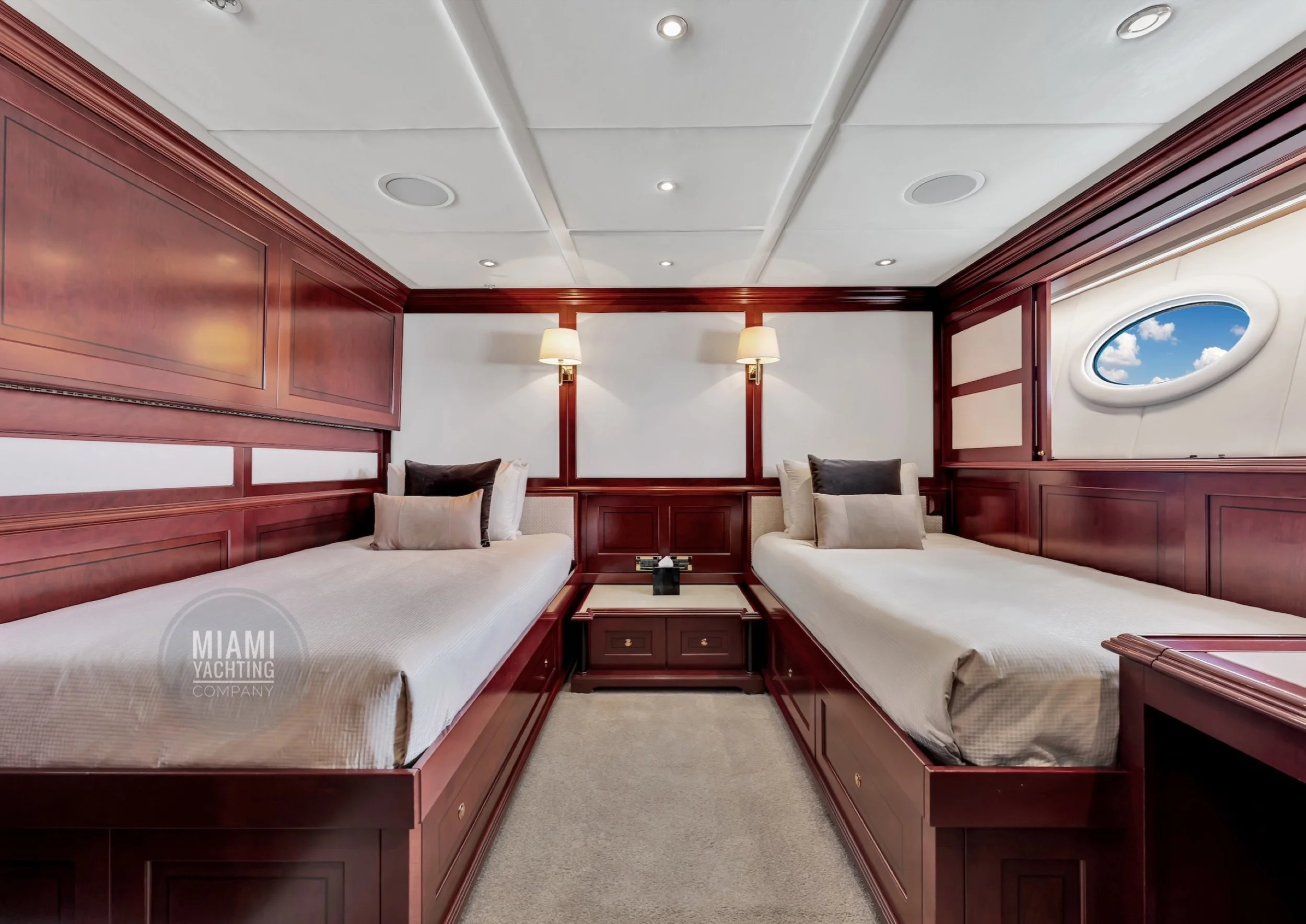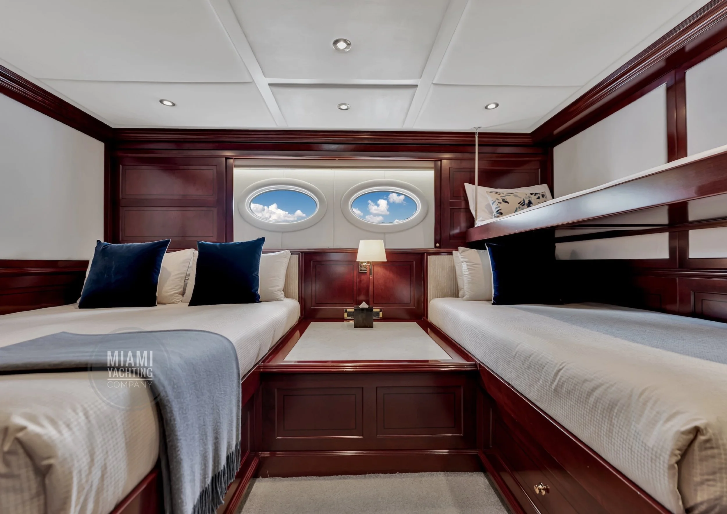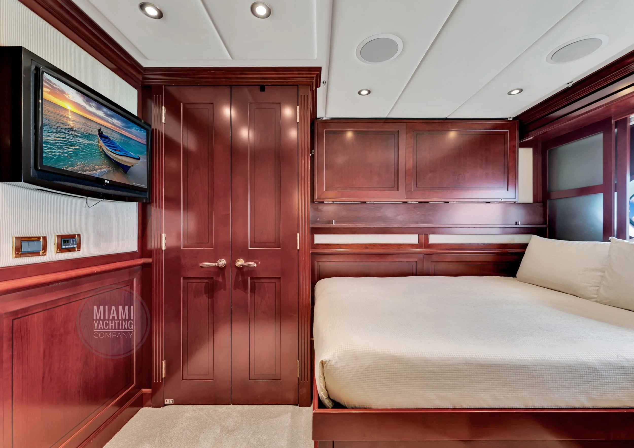 The interior is refined and contemporary, blending rich mahogany cabinetry with polished wood flooring and sleek black accents. The salon is bright and spacious with oversized windows, a formal dining area, and state-of-the-art entertainment systems. Every detail is crafted to provide an exceptional onboard experience that seamlessly combines style and relaxation for your Miami yacht charter.