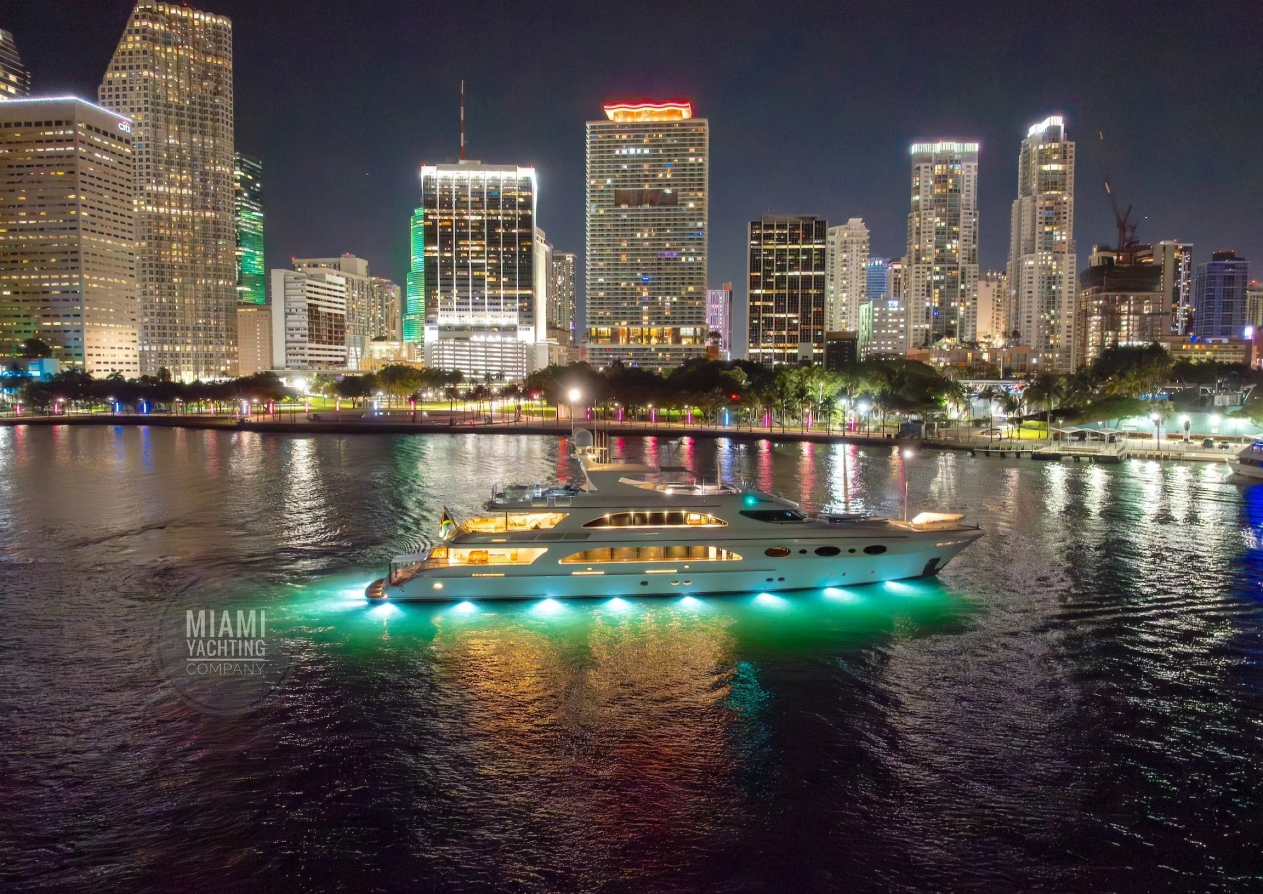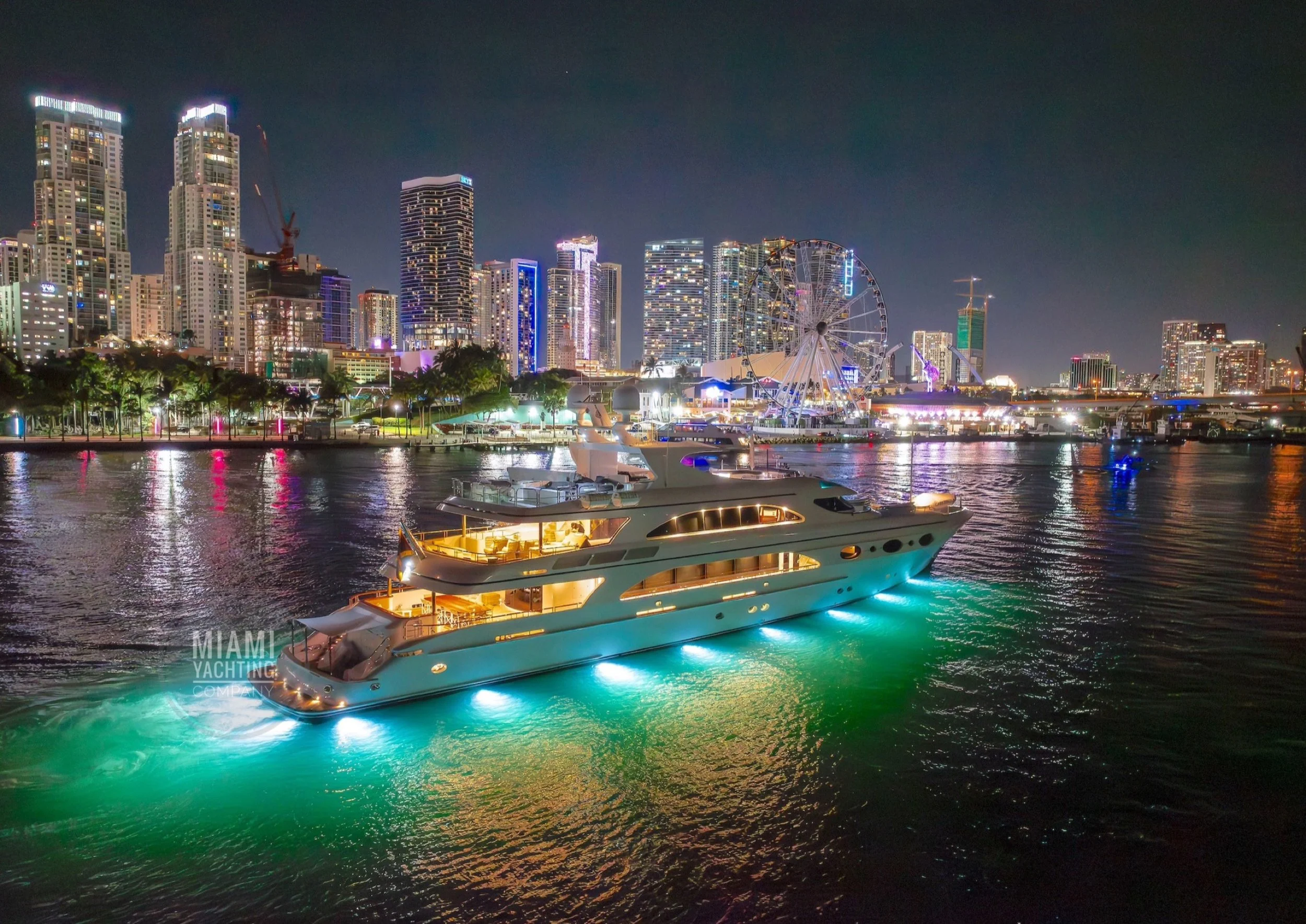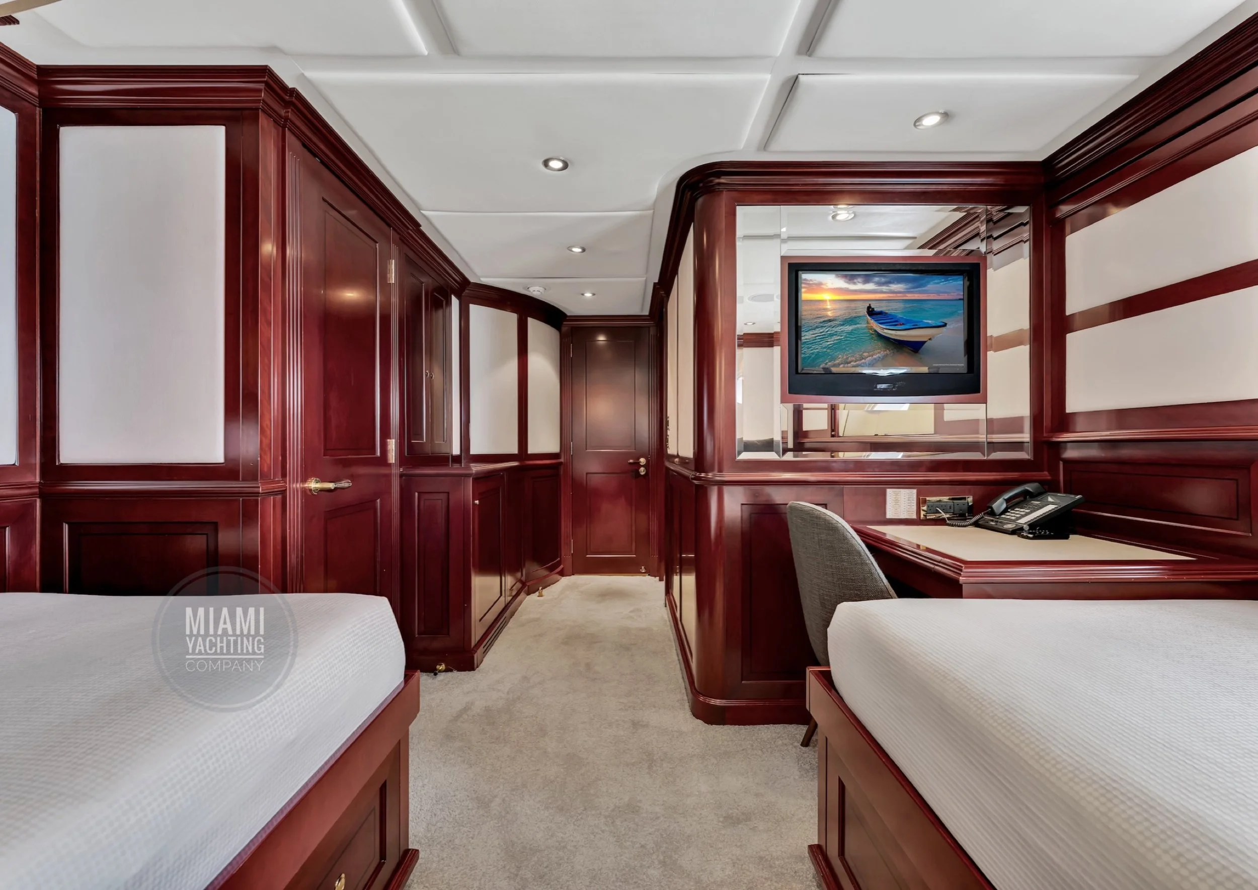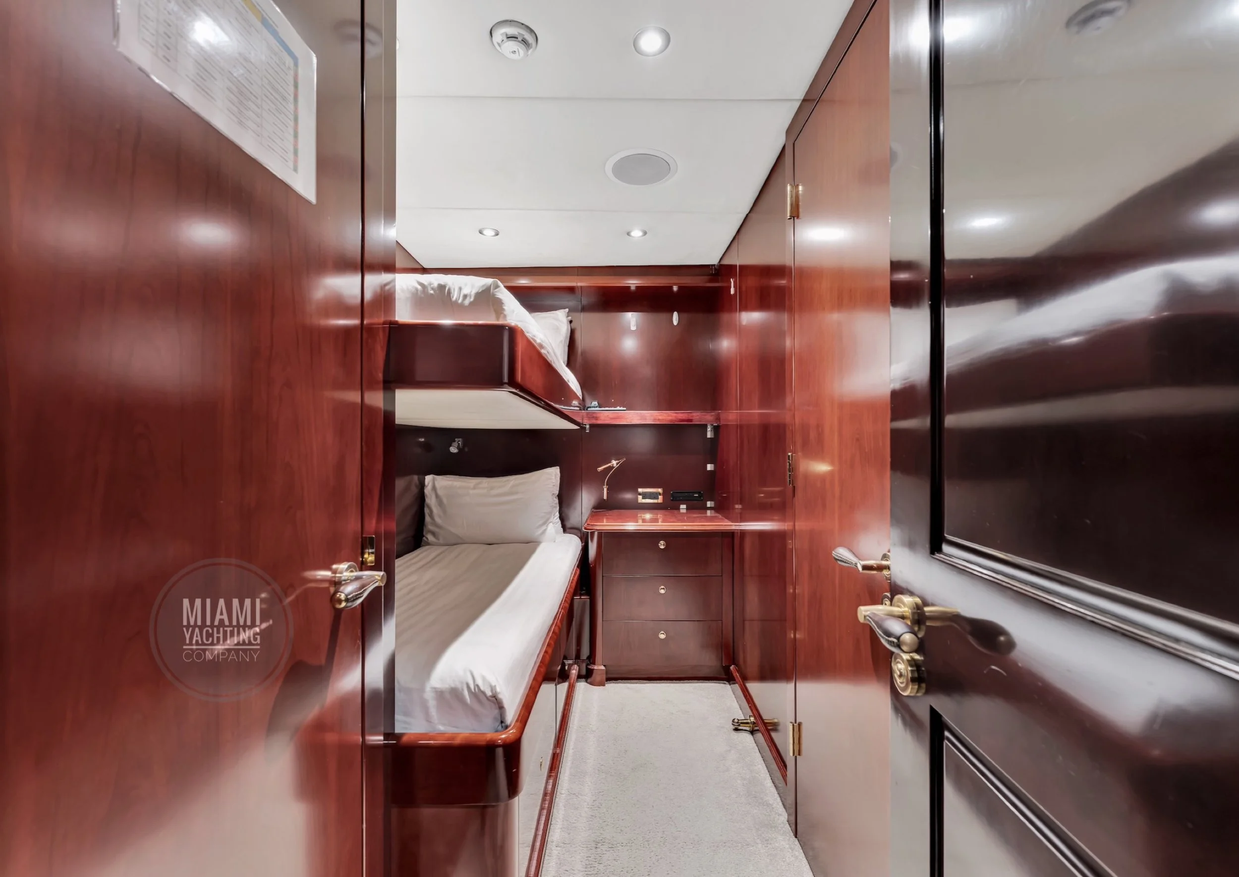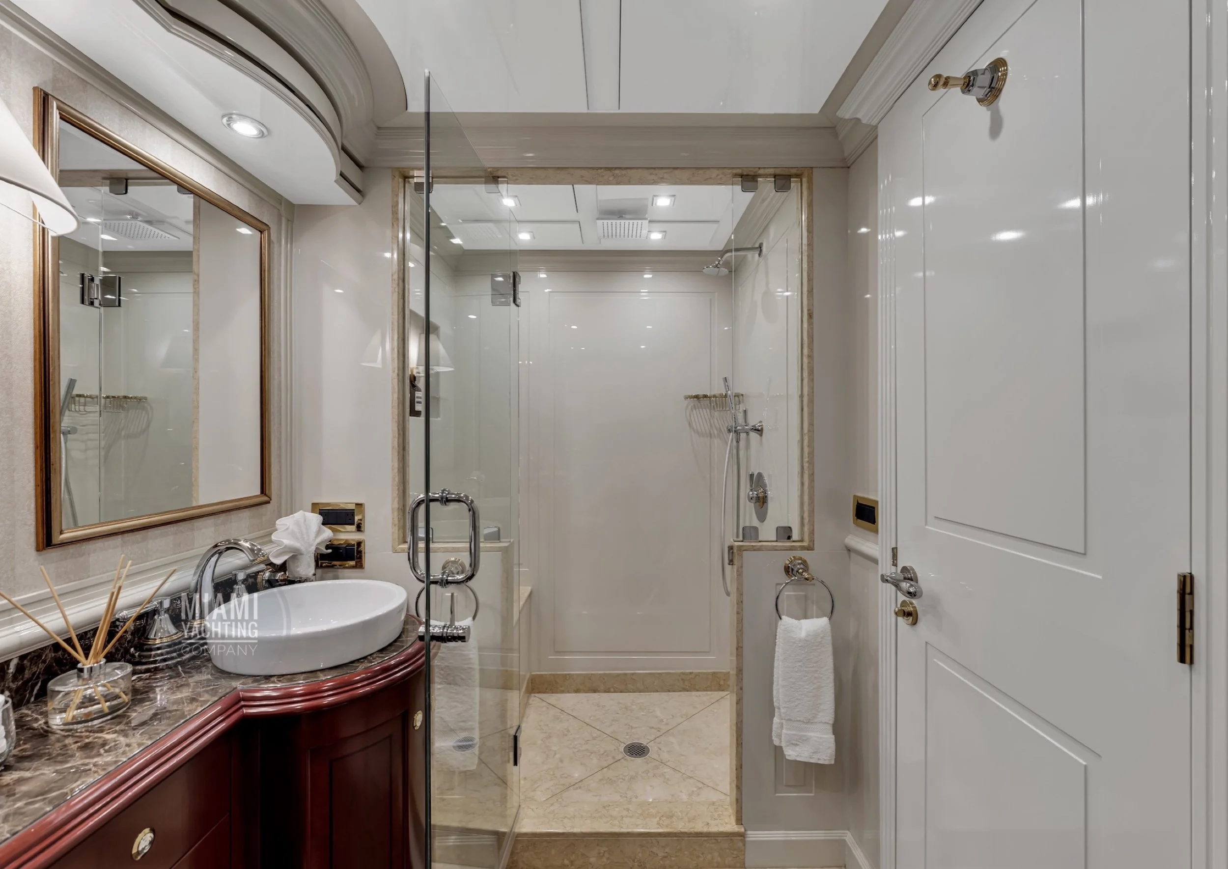 The interior is refined and contemporary, blending rich mahogany cabinetry with polished wood flooring and sleek black accents. The salon is bright and spacious with oversized windows, a formal dining area, and state-of-the-art entertainment systems. Every detail is crafted to provide an exceptional onboard experience that seamlessly combines style and relaxation for your Miami yacht charter.