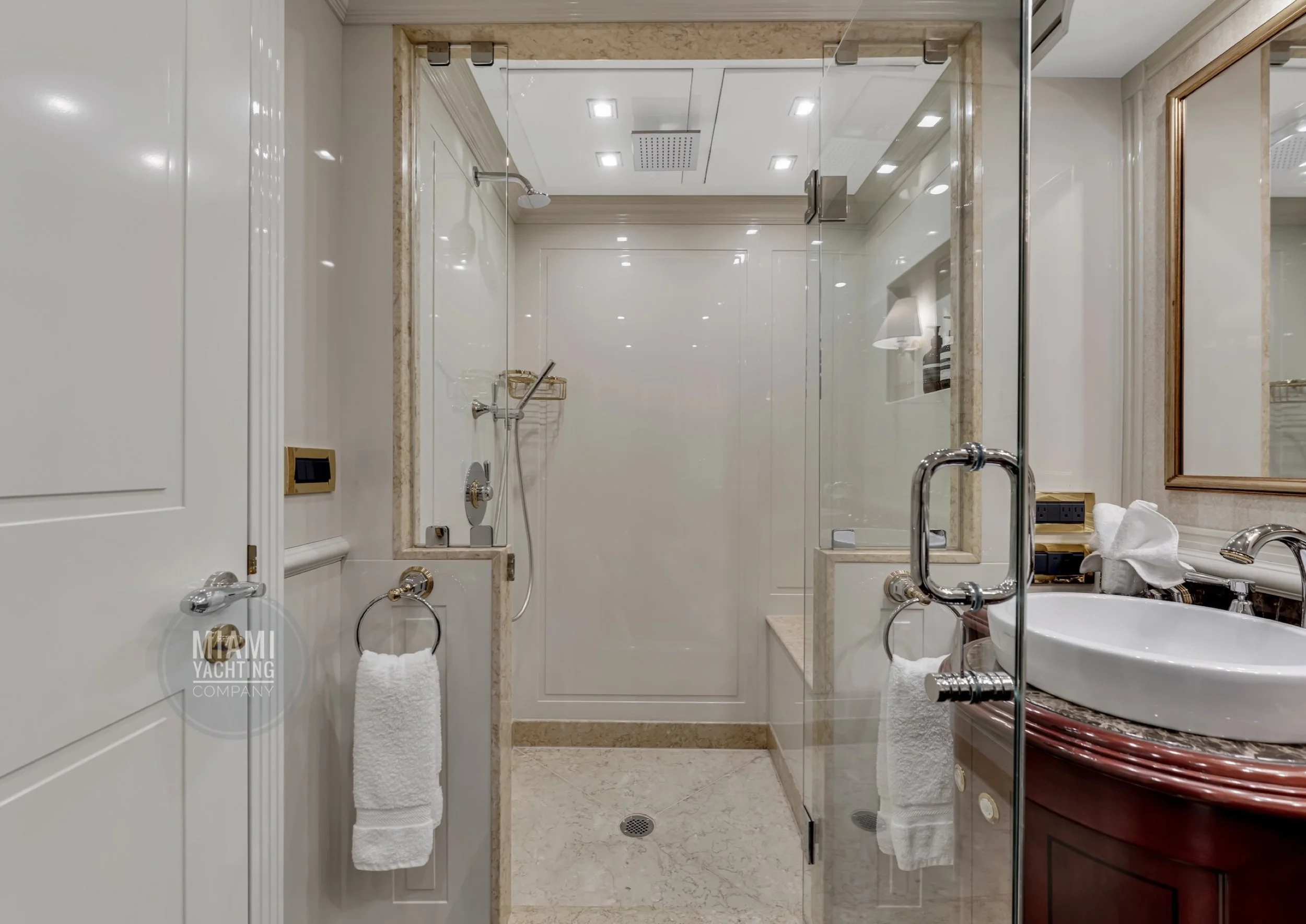 • Master Suite includes a king bed, walk-in closet, private en-suite with elegant finishes, and aft-facing sliding glass doors that open onto the bridge deck with breathtaking views
