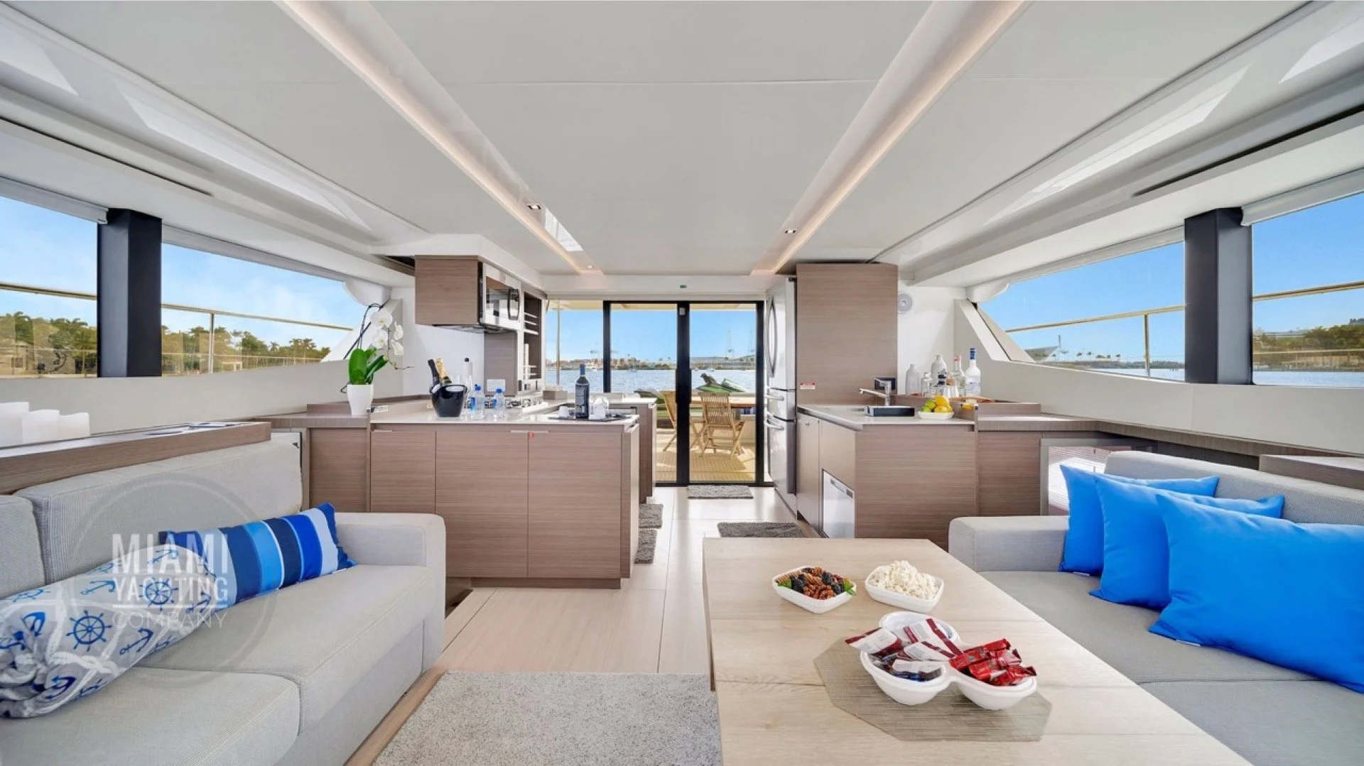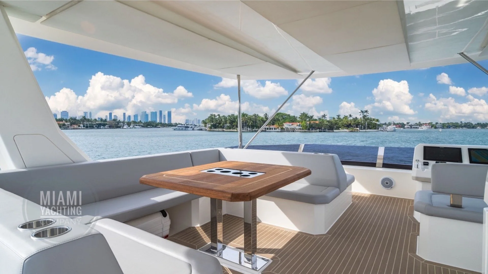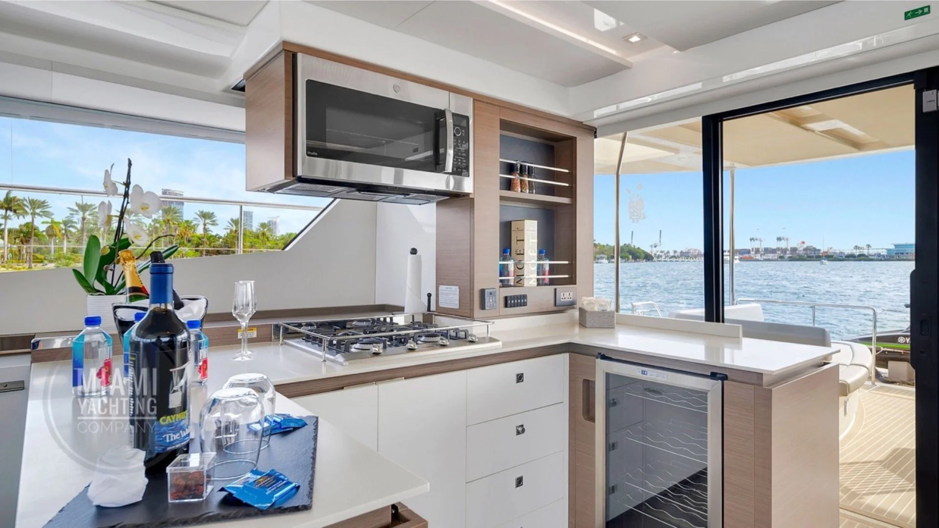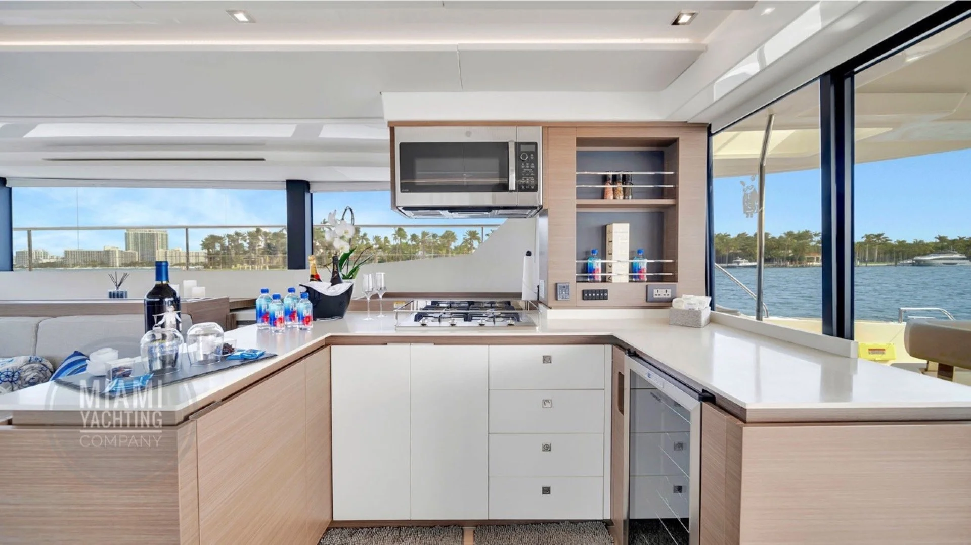 Bask in outdoor entertainment like never before aboard the Leopard 53, where every detail is tailored to enhance your Miami yacht rental experience. From the ample seating encircling a spacious table on deck to the intuitive design of the flybridge and helm station, every element is meticulously crafted to anticipate your every need. Whether you're gathering with friends to recount the day's adventures, savoring a meal against the backdrop of breathtaking Miami views, or simply relishing in the salt-kissed breeze, the Leopard 53 sets the stage for unforgettable moments on the water. Embark on your Miami adventure and let the Leopard 53 Powercat redefine your cruising experience.