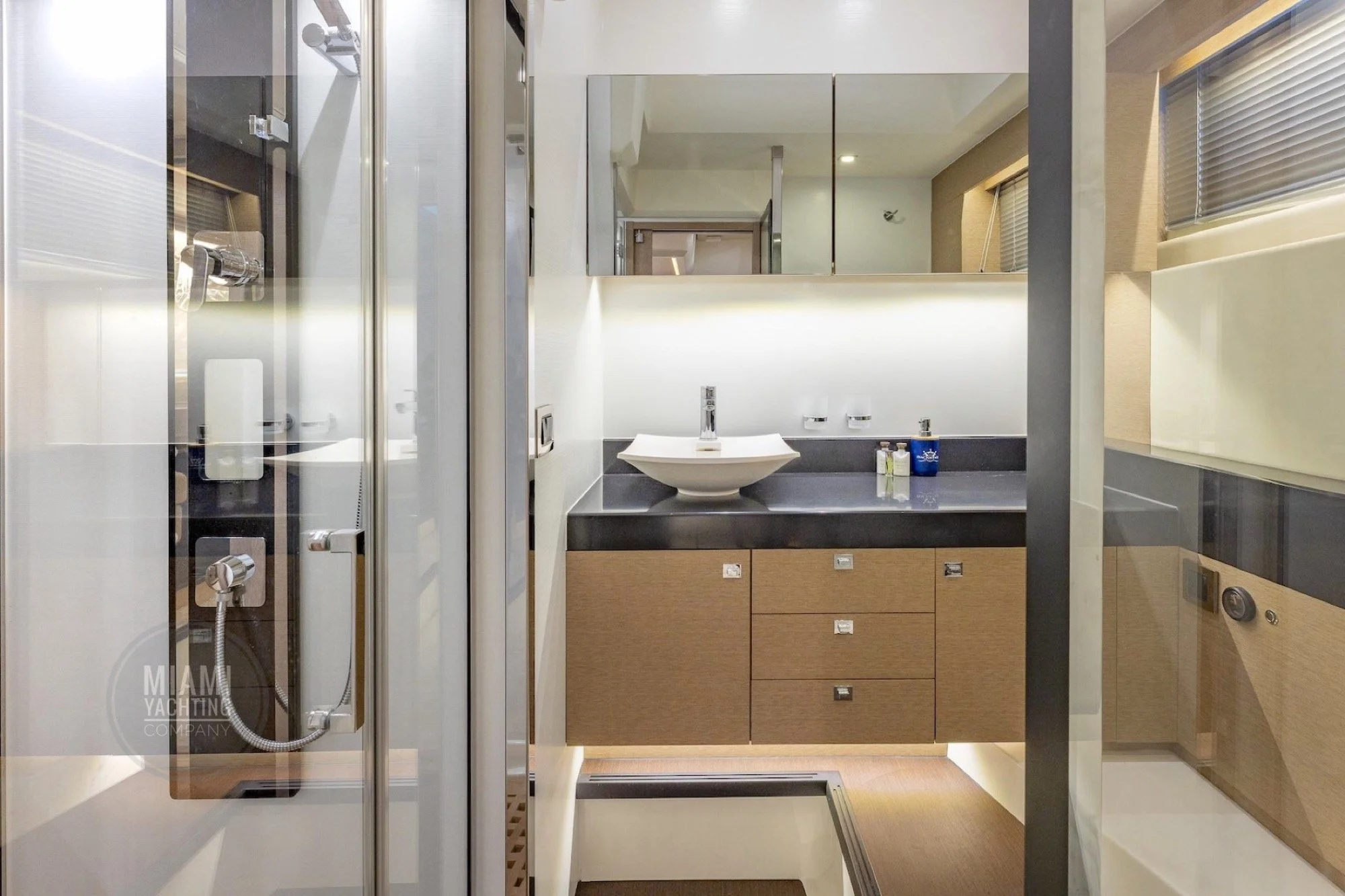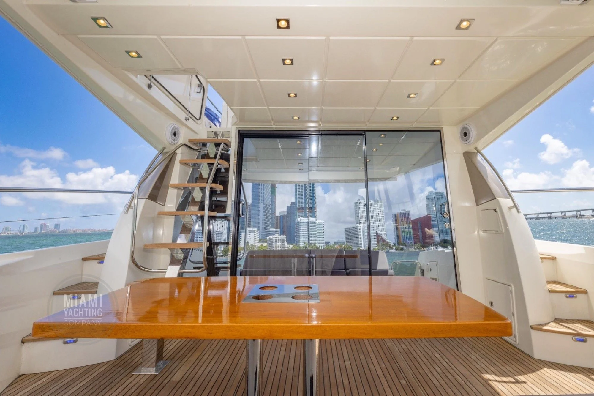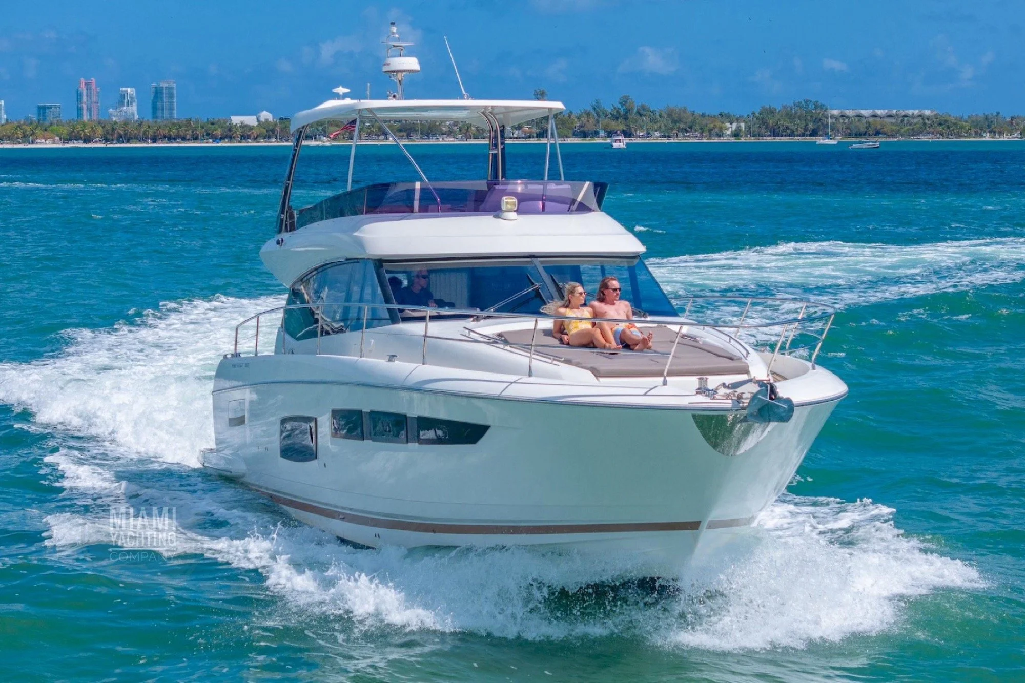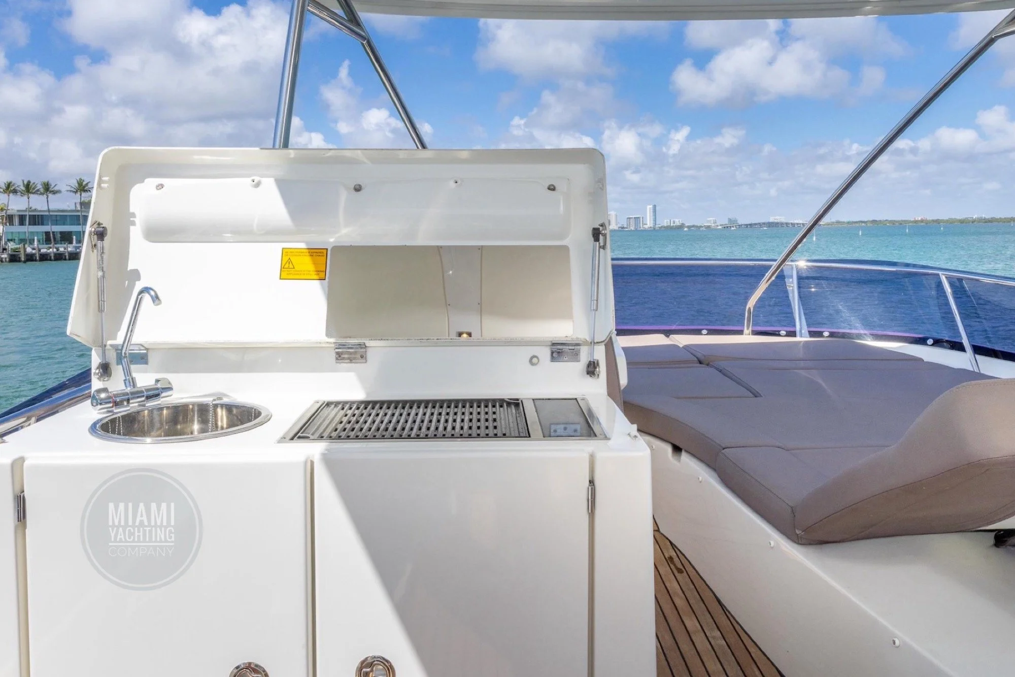 Guests often choose this Miami yacht rental for cruising along Miami Beach, exploring the calm waters surrounding Key Biscayne, or enjoying a scenic afternoon at one of the sandbars. The spacious flybridge lounge creates an inviting place to take in panoramic views while moving through some of the most picturesque waterways in South Florida.