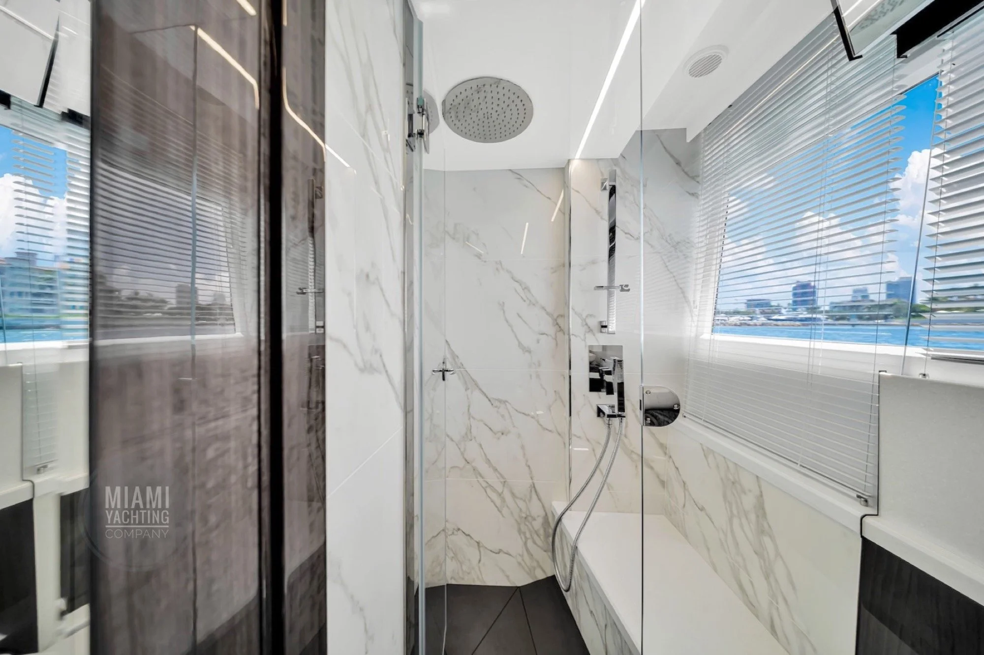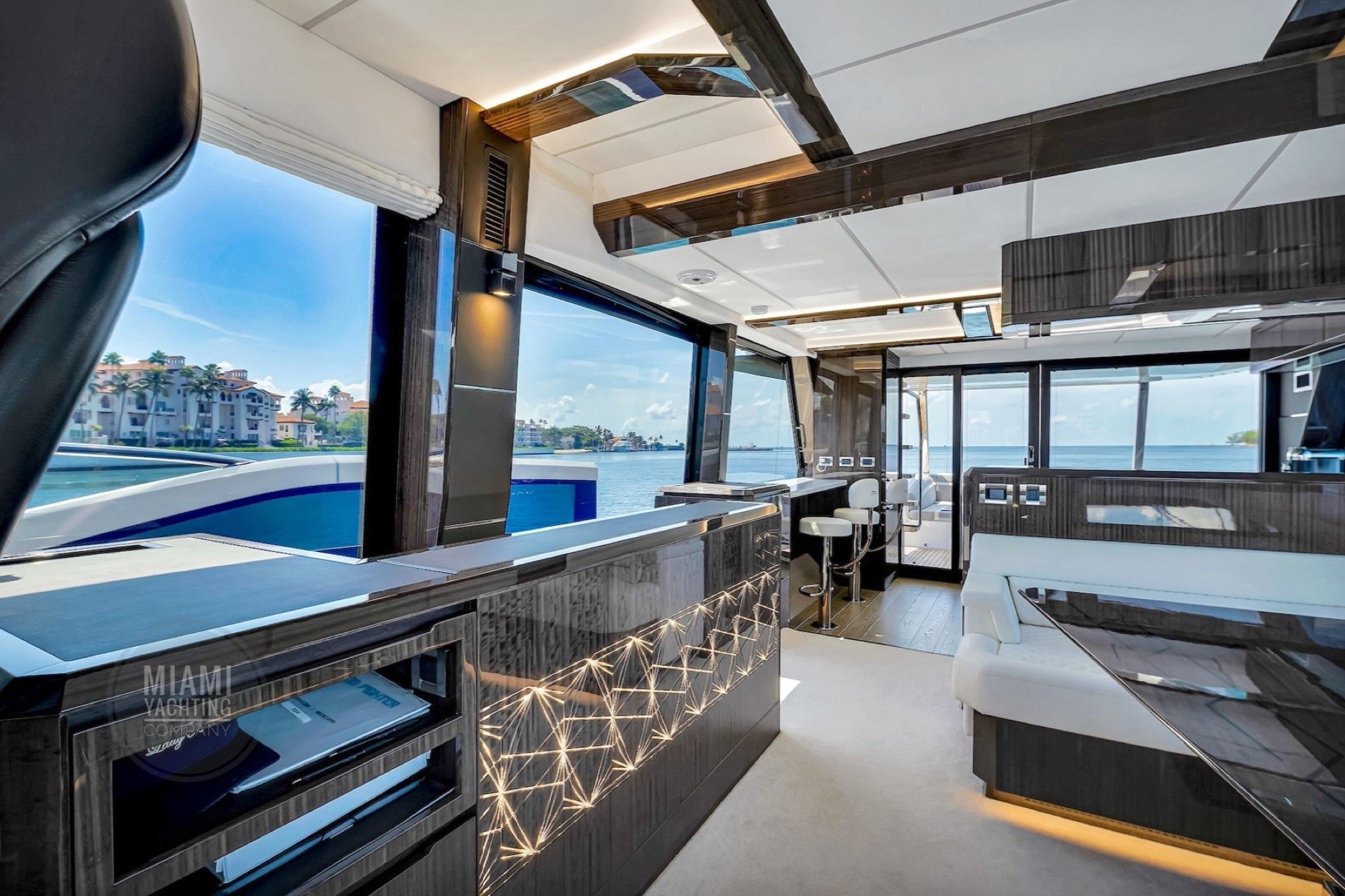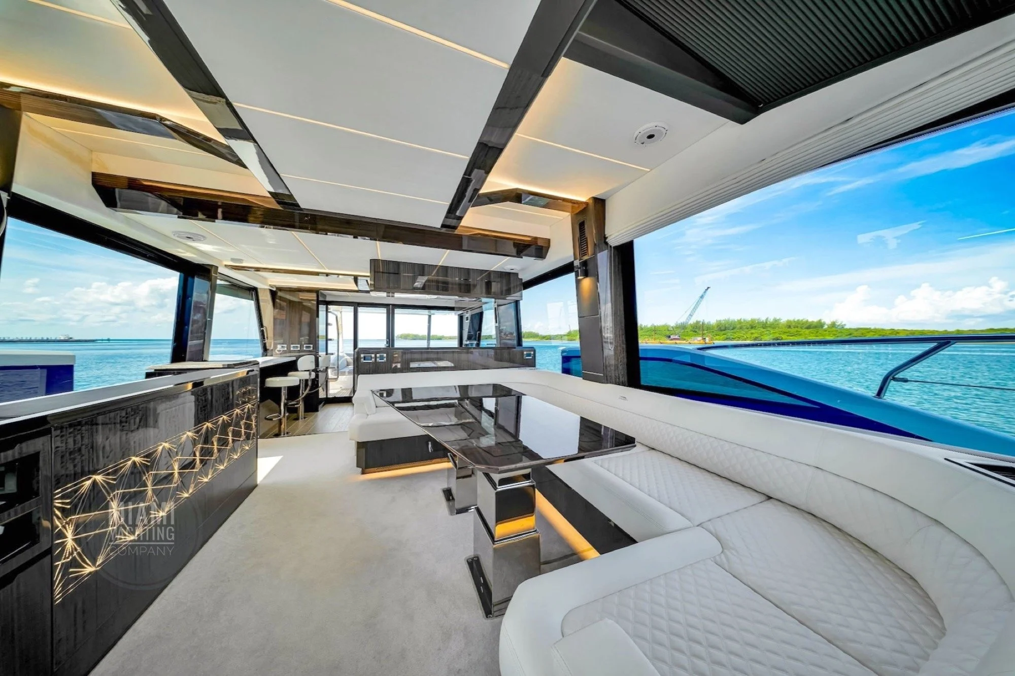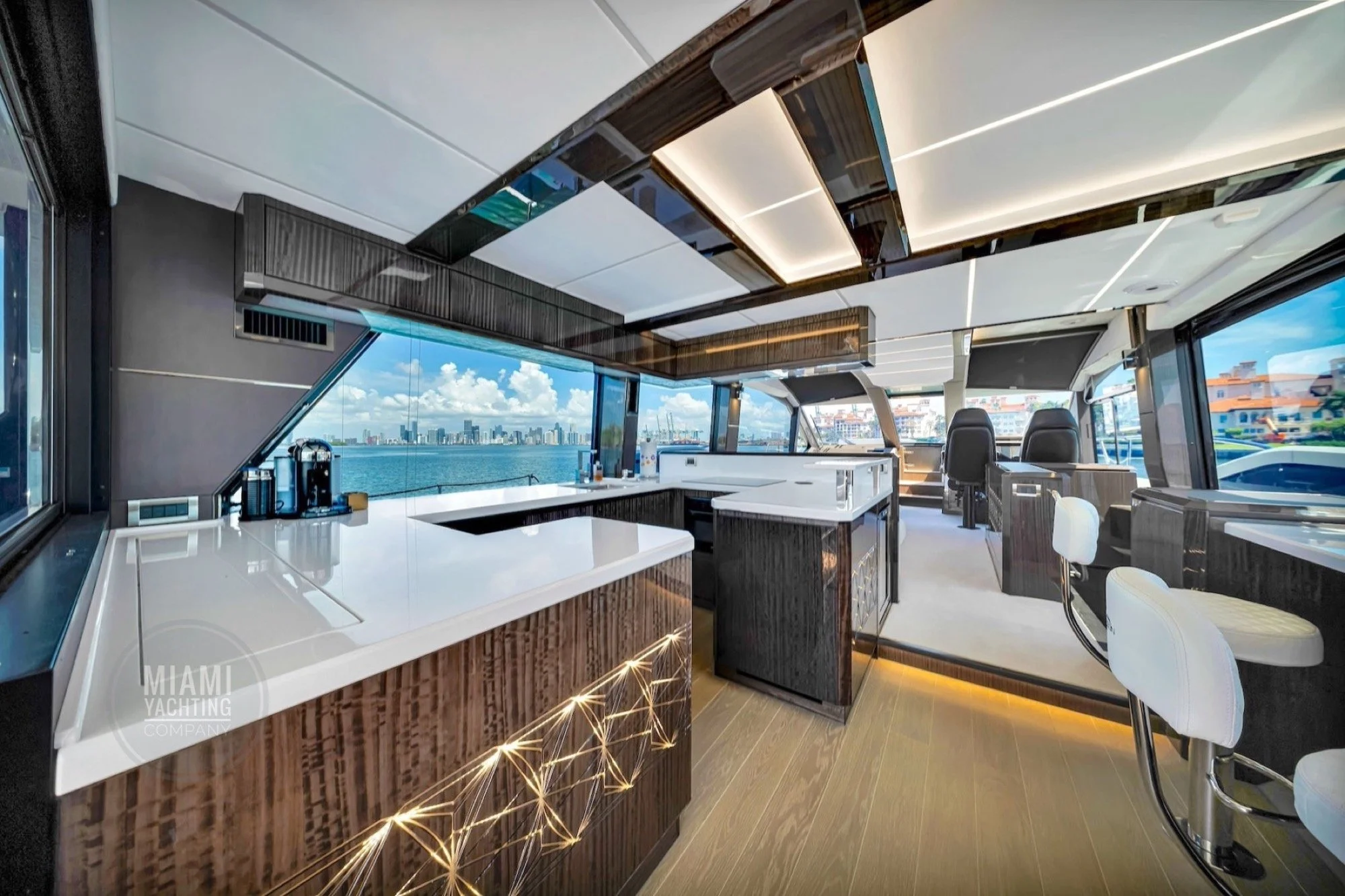 Inside the yacht features a bright modern interior with large windows clean lines and premium finishes that create an inviting environment between destinations. Whether planning a celebration a relaxed day on the water or a private Miami yacht charter this versatile yacht delivers a polished and memorable way to explore the city from the water.