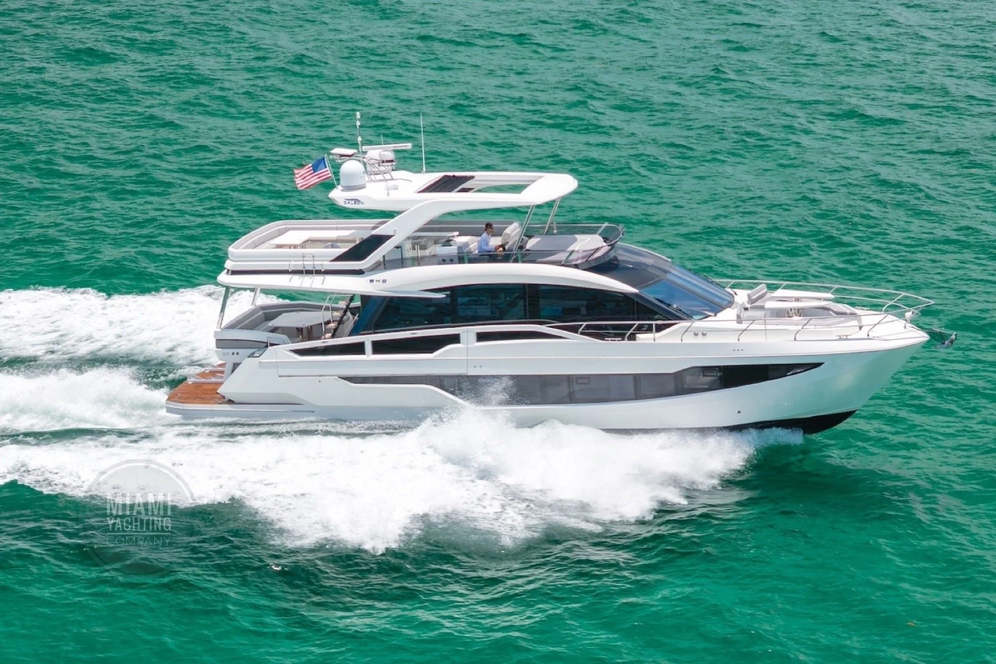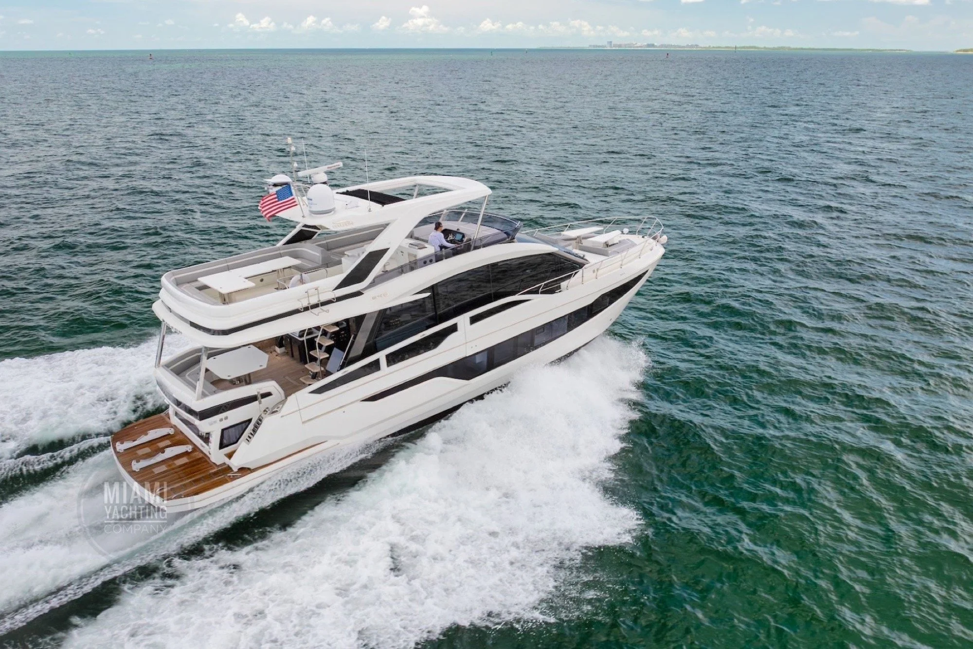 The Galeon 640 is an excellent choice for guests searching for a yacht rental in Miami that offers space versatility and contemporary European design. With 68 feet of length overall, its balanced profile and innovative layout make it ideal for cruising Miami Beach Biscayne Bay and nearby sandbars while enjoying a comfortable and stylish atmosphere.