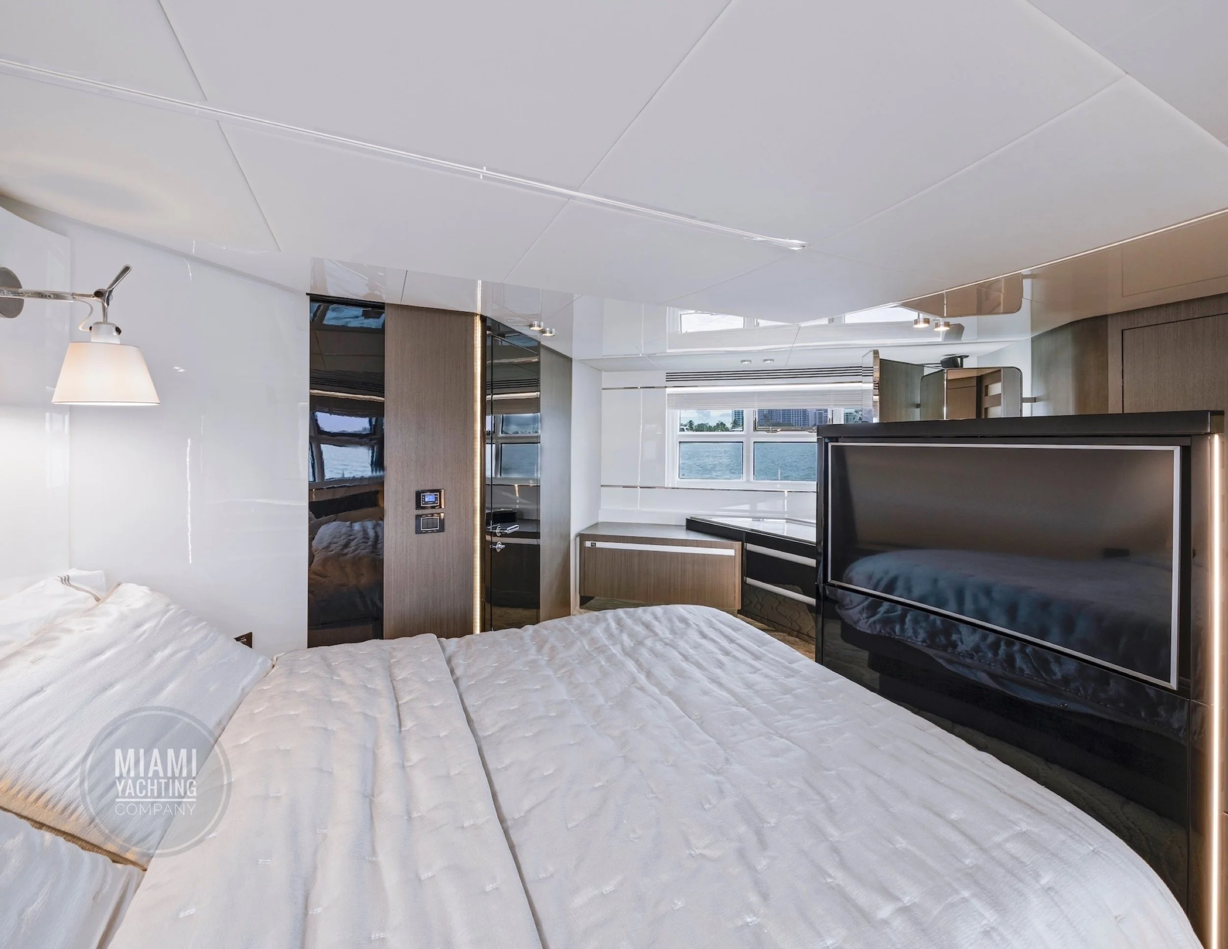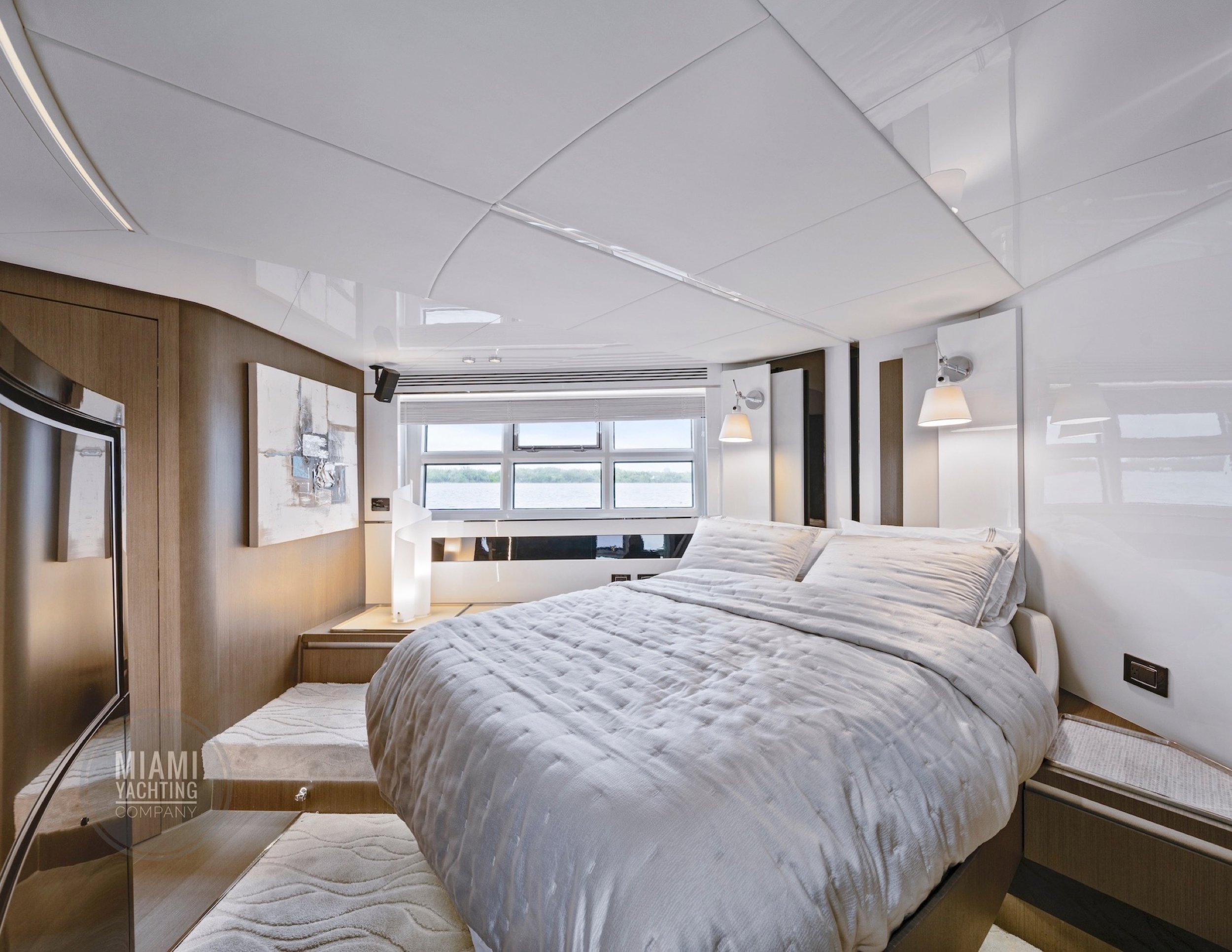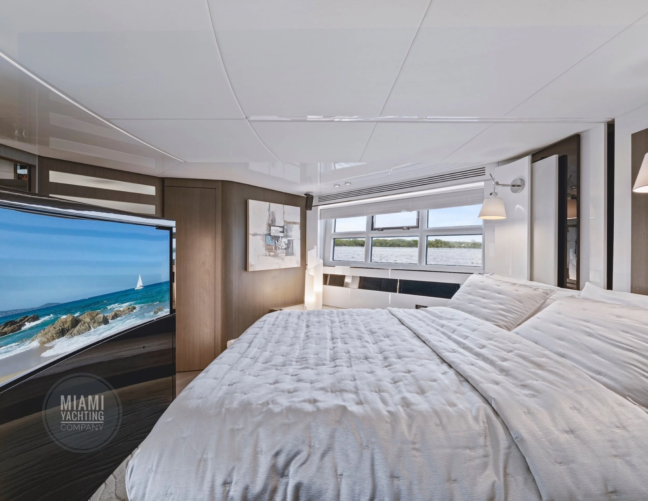 From the moment you step aboard, the experience is refined and seamless. The open layout flows from the foredeck sunpads to the aft lounge and into a bright, contemporary salon surrounded by panoramic windows. Below deck, four impeccably appointed staterooms include a full beam owner's suite and en suite baths throughout, offering unmatched comfort for up to eight guests.
