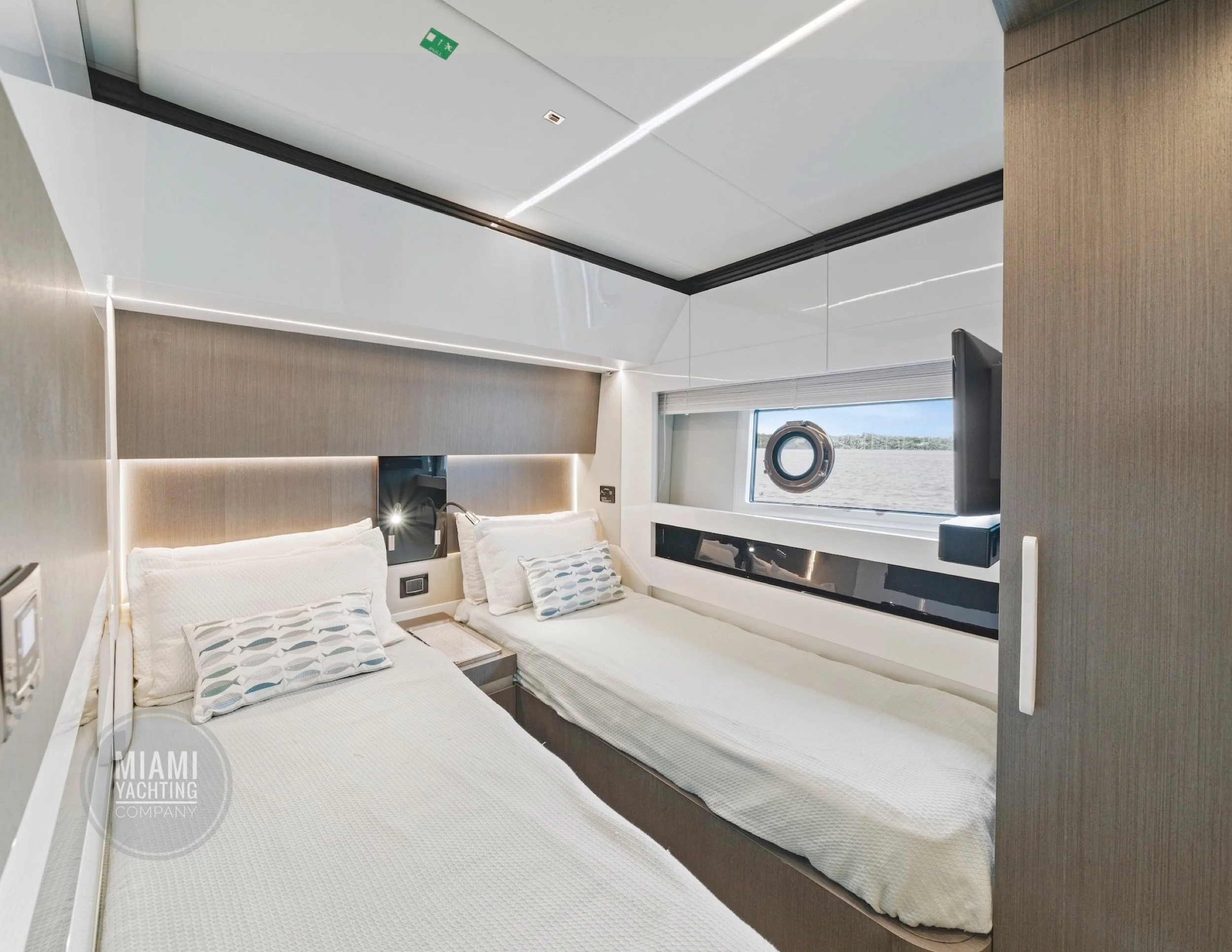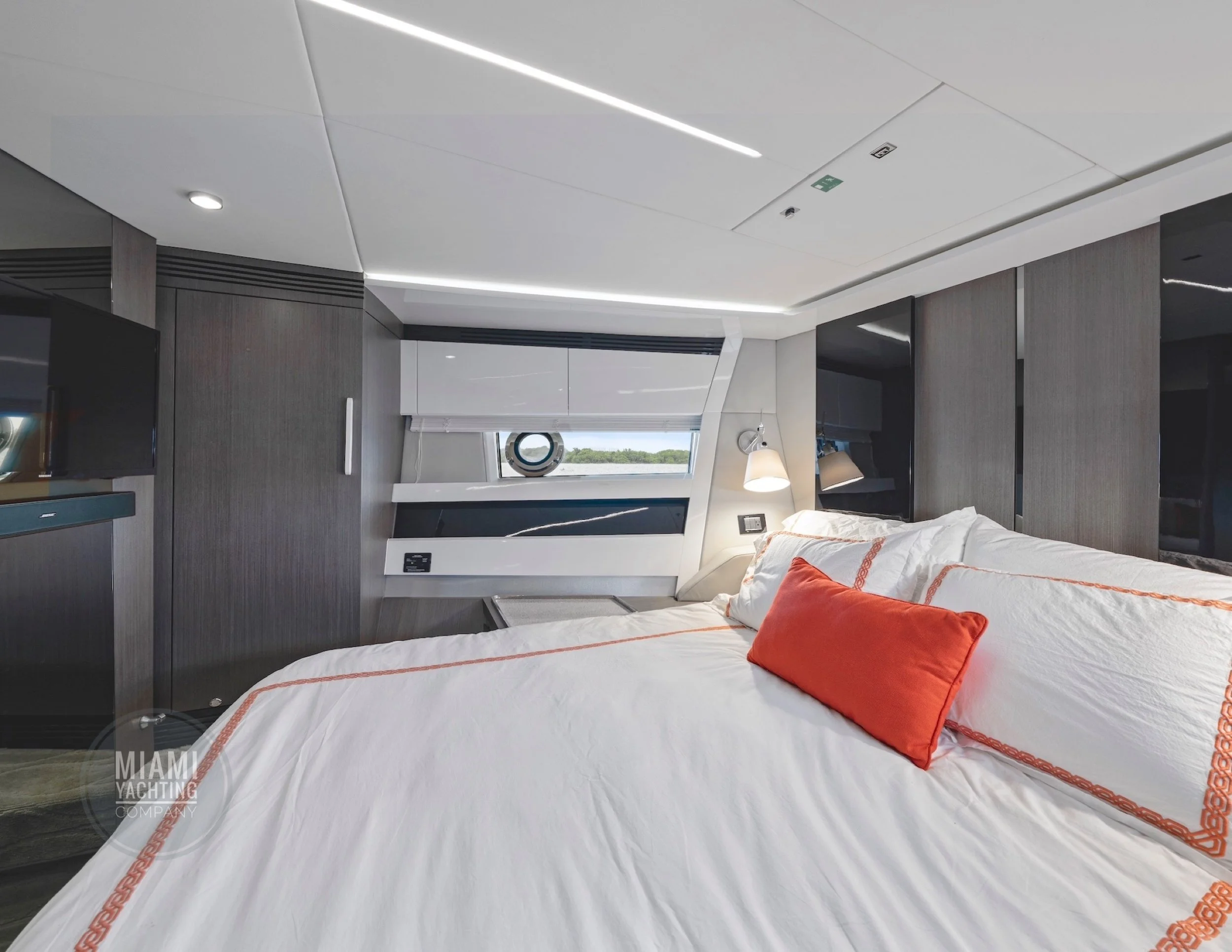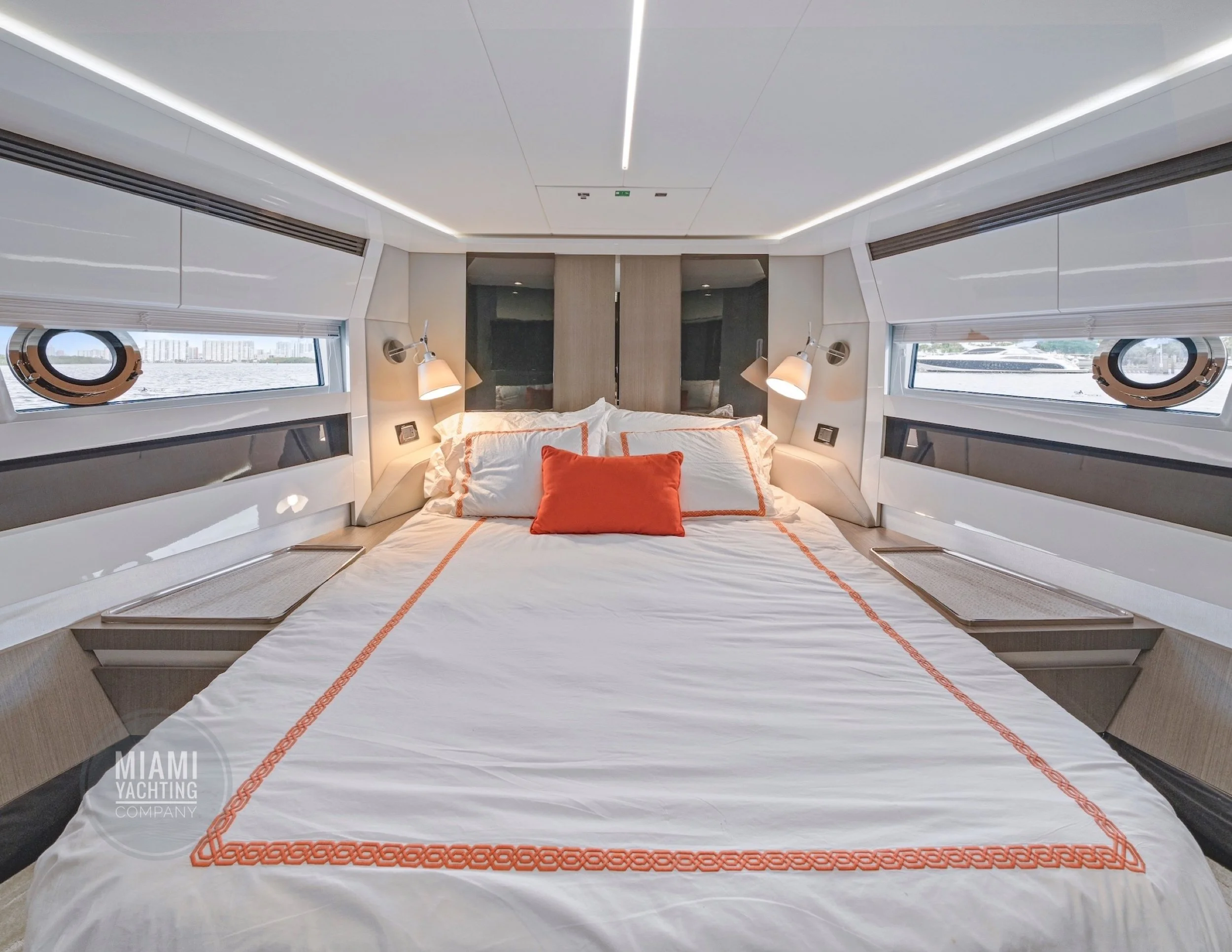 From the moment you step aboard, the experience is refined and seamless. The open layout flows from the foredeck sunpads to the aft lounge and into a bright, contemporary salon surrounded by panoramic windows. Below deck, four impeccably appointed staterooms include a full beam owner's suite and en suite baths throughout, offering unmatched comfort for up to eight guests.