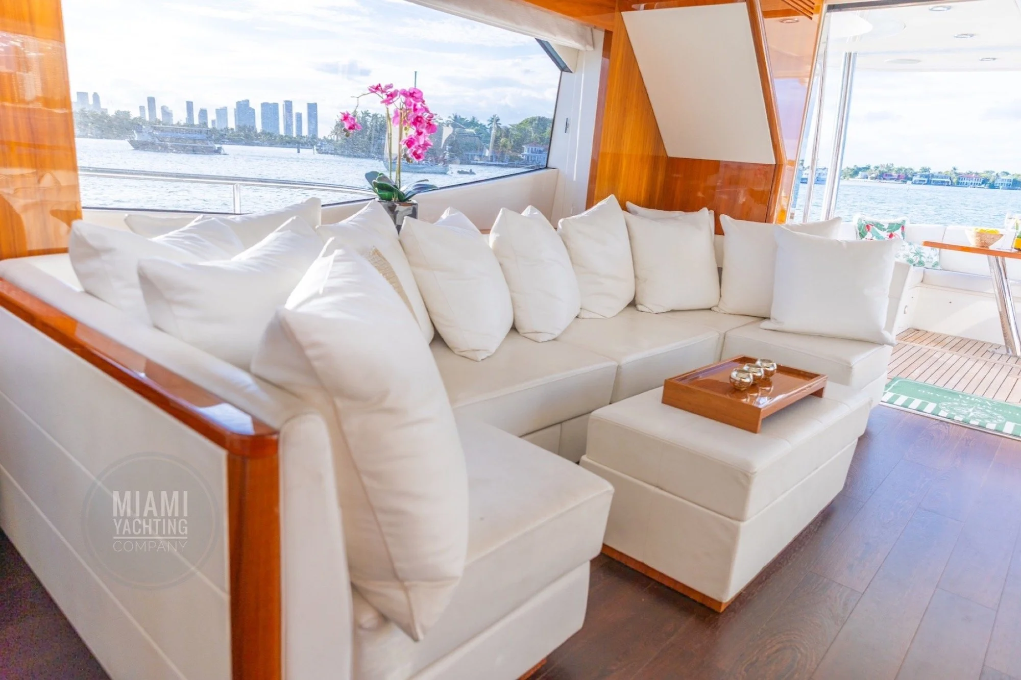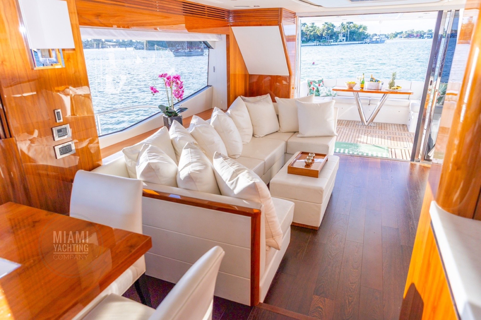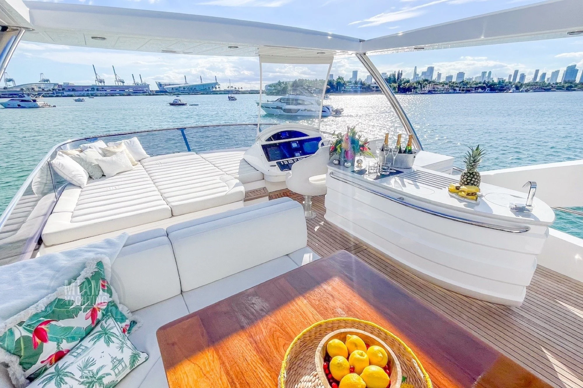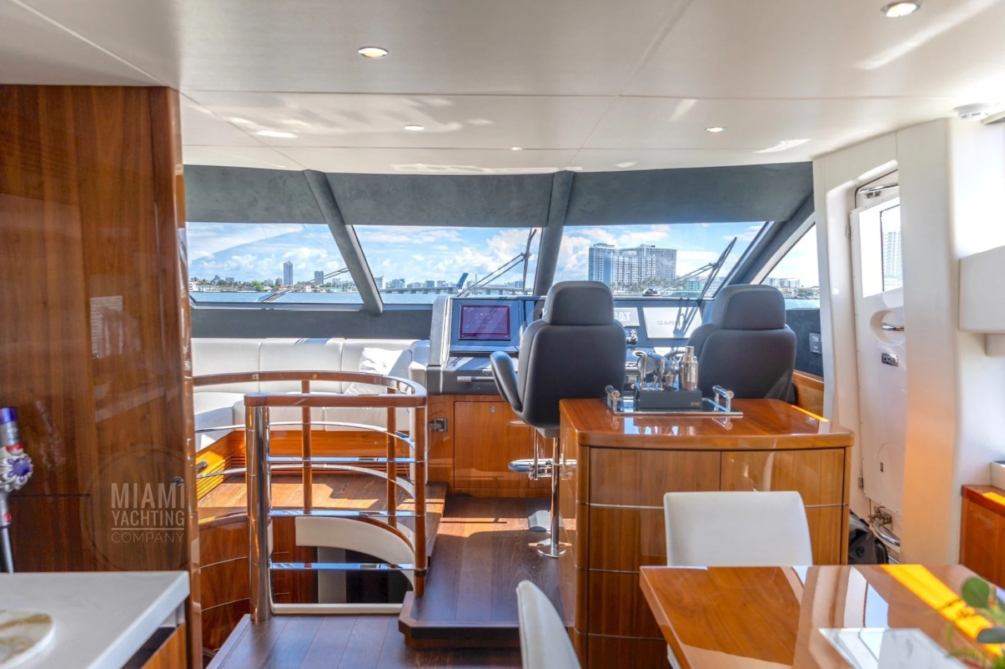 The flybridge features ample seating, sun lounging areas and an open layout ideal for gathering with guests while taking in wide views of Biscayne Bay and the Miami skyline. Inside, the yacht offers a bright and contemporary salon with large windows, high end finishes and a seamless flow between indoor and outdoor spaces. Multiple staterooms provide private and comfortable accommodations, creating a setting that feels both welcoming and luxurious.