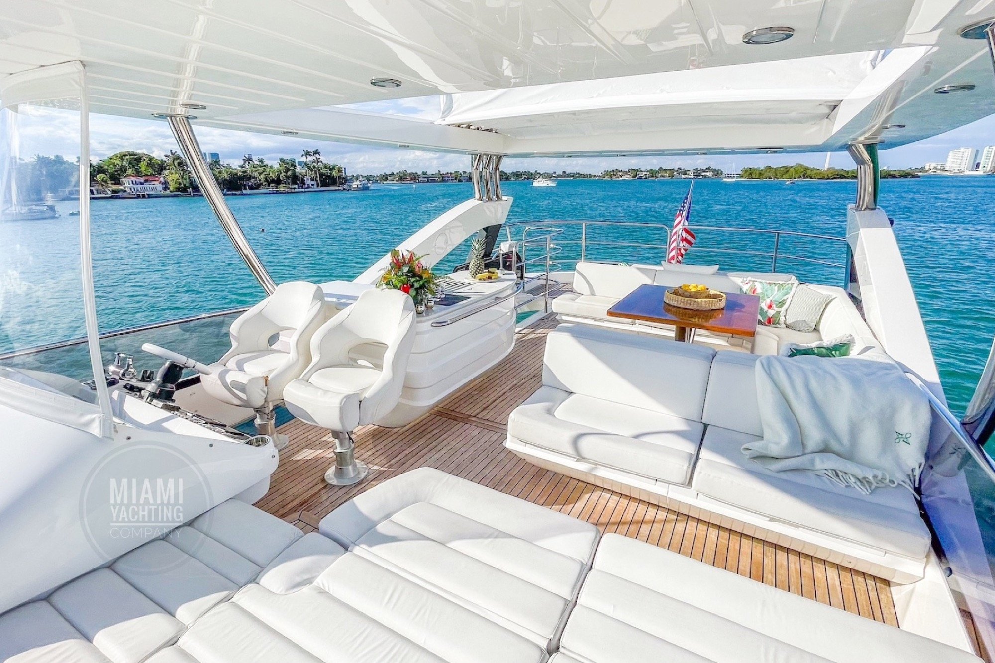 The 75 ft Sunseeker is a beautifully balanced luxury yacht that combines sleek design with generous living space, making it an exceptional choice for a Miami yacht rental. With its elegant profile and expansive flybridge, this yacht offers a calm and refined atmosphere that feels perfectly suited for relaxed cruising, sightseeing and enjoying Miami from the water.